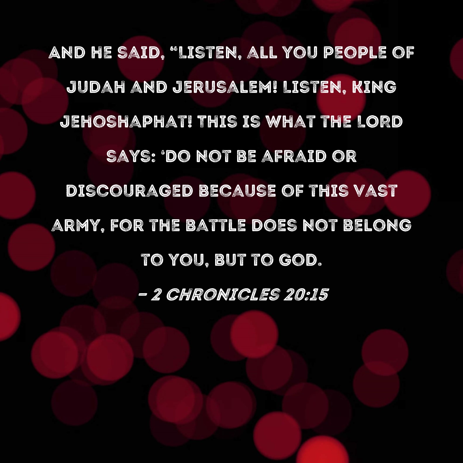 2 Chronicles 20:15 And he said, "Listen, all you people of Judah and Jerusalem! Listen, King Jehoshaphat! This is what the LORD says: 'Do not be afraid or discouraged because of this vast army, for the battle does not belong to you, but to God.