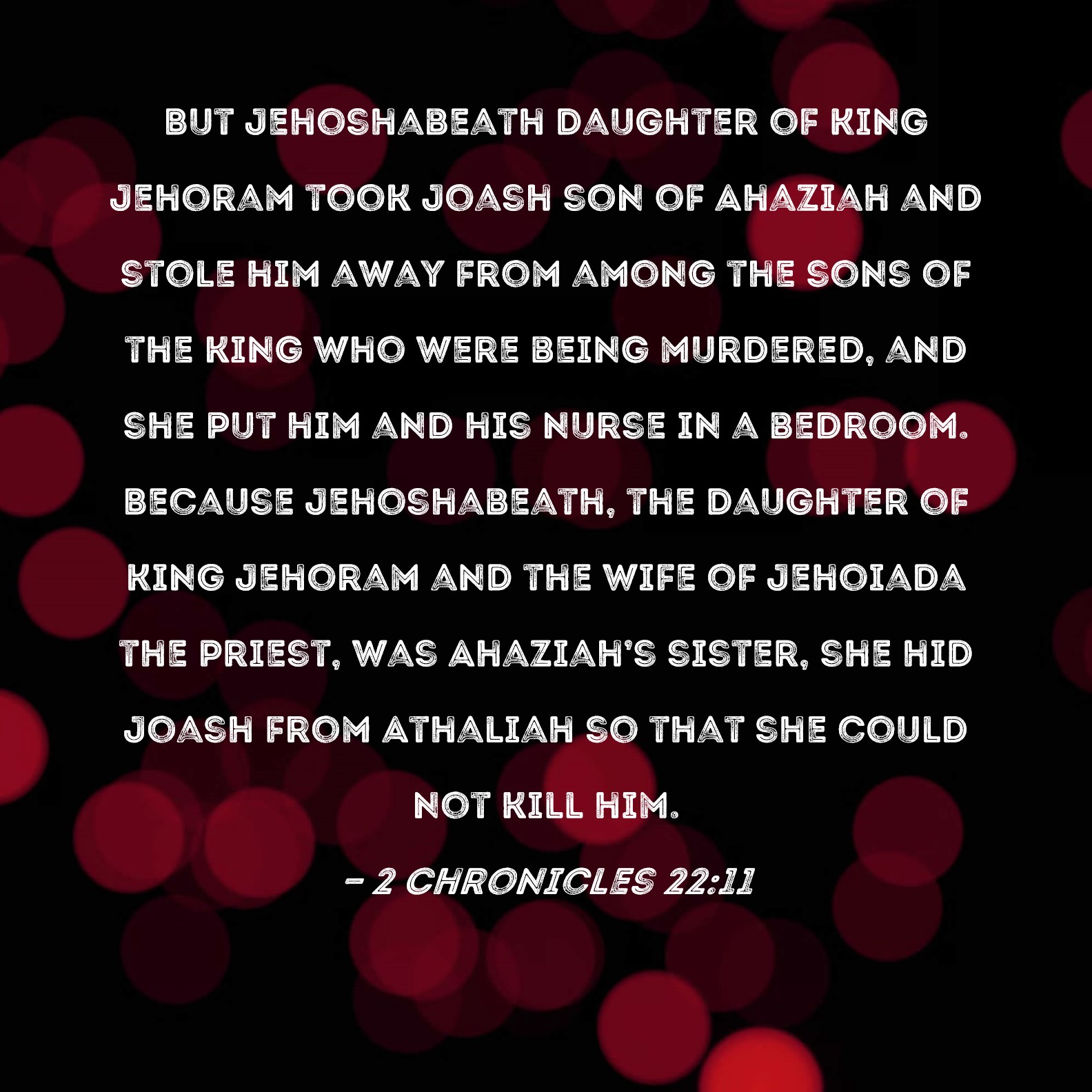 2 Chronicles 22:11 But Jehoshabeath daughter of King Jehoram took Joash son of Ahaziah and stole him away from among the sons of the king who were being murdered, and she put him and his nurse in a bedroom. Because Jehoshabeath, the daughter of King Jehoram and the wife of Jehoiada the priest, was Ahaziah's sister, she hid Joash from Athaliah so that she could not kill him.