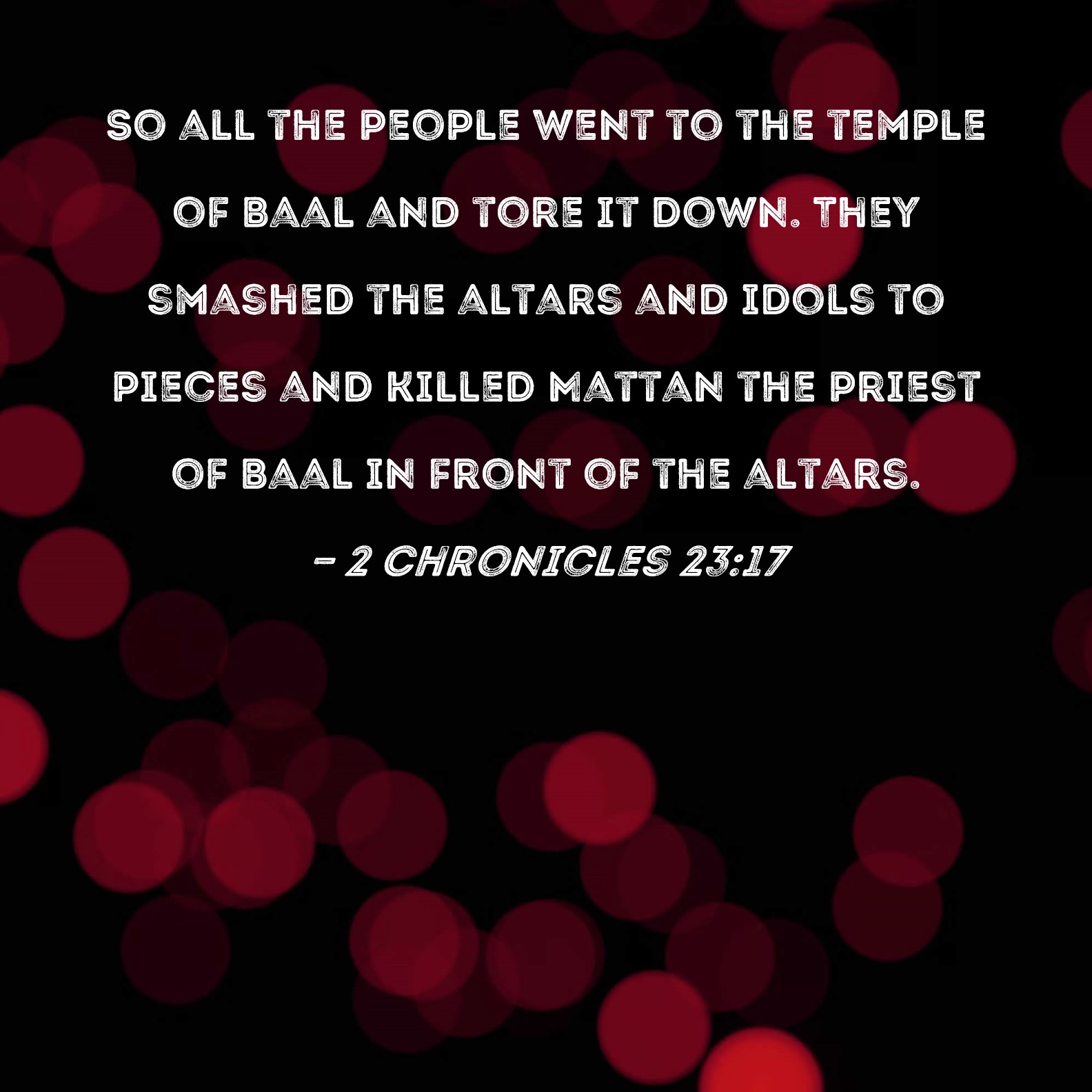 2 Chronicles 23:17 So all the people went to the temple of Baal and tore it down. They smashed the altars and idols to pieces and killed Mattan the priest of Baal in front of the altars.