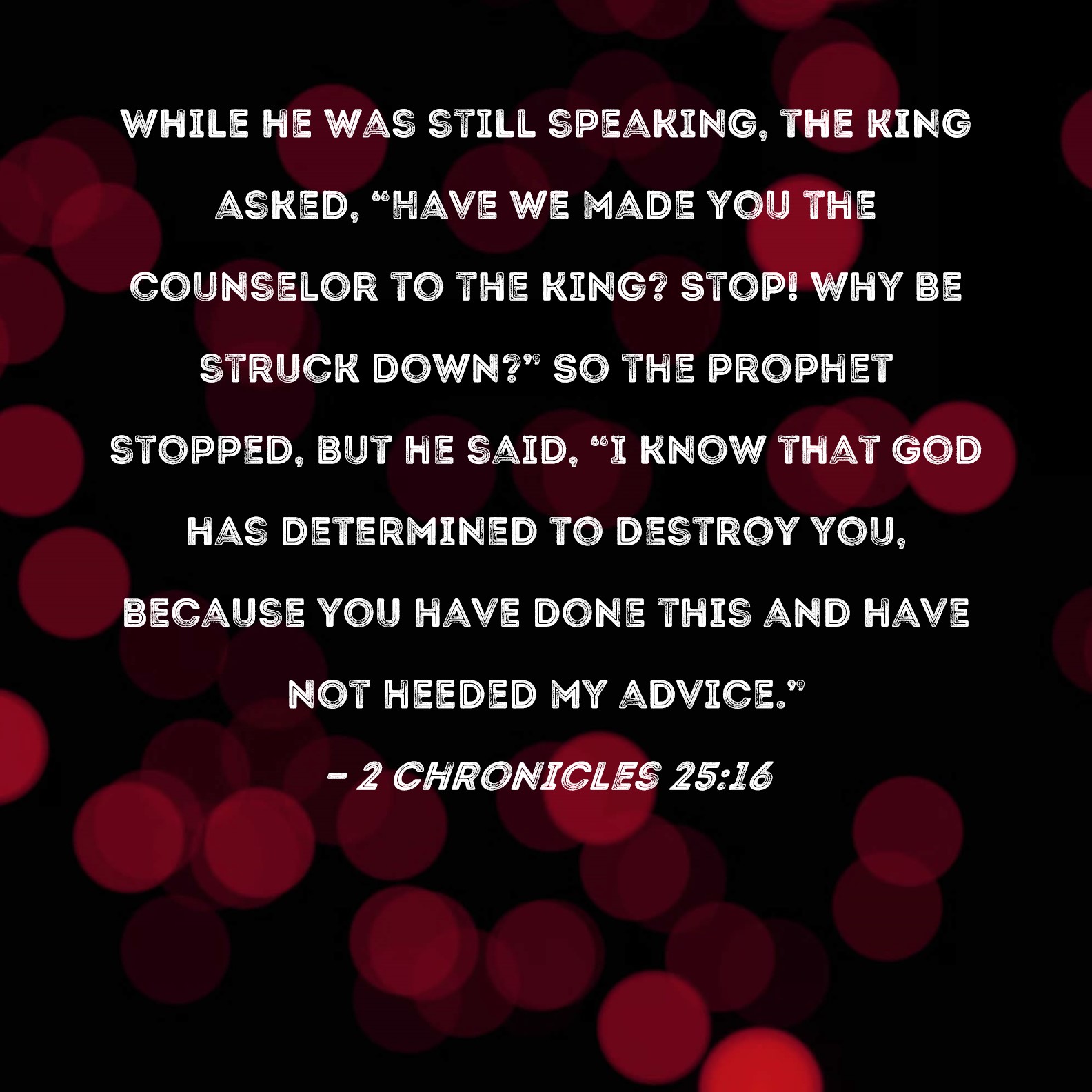 2 Chronicles 25:16 While he was still speaking, the king asked, "Have we made you the counselor to the king? Stop! Why be struck down?" So the prophet stopped, but he said, "I know that God has determined to destroy you, because you have done this and have not heeded my advice."
