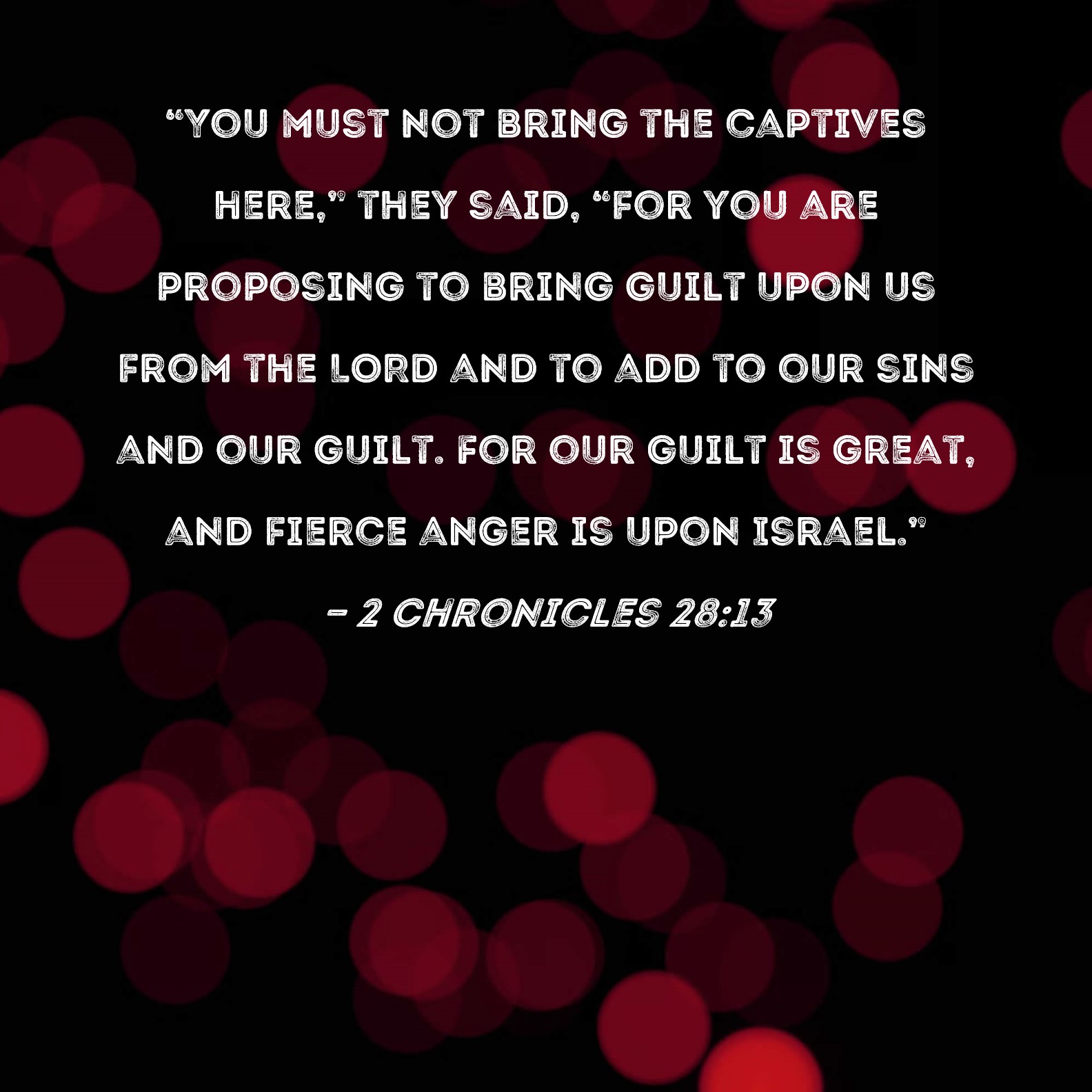 2 Chronicles 28:13 "You must not bring the captives here," they said, "for you are proposing to bring guilt upon us from the LORD and to add to our sins and our guilt. For our guilt is great, and fierce anger is upon Israel."