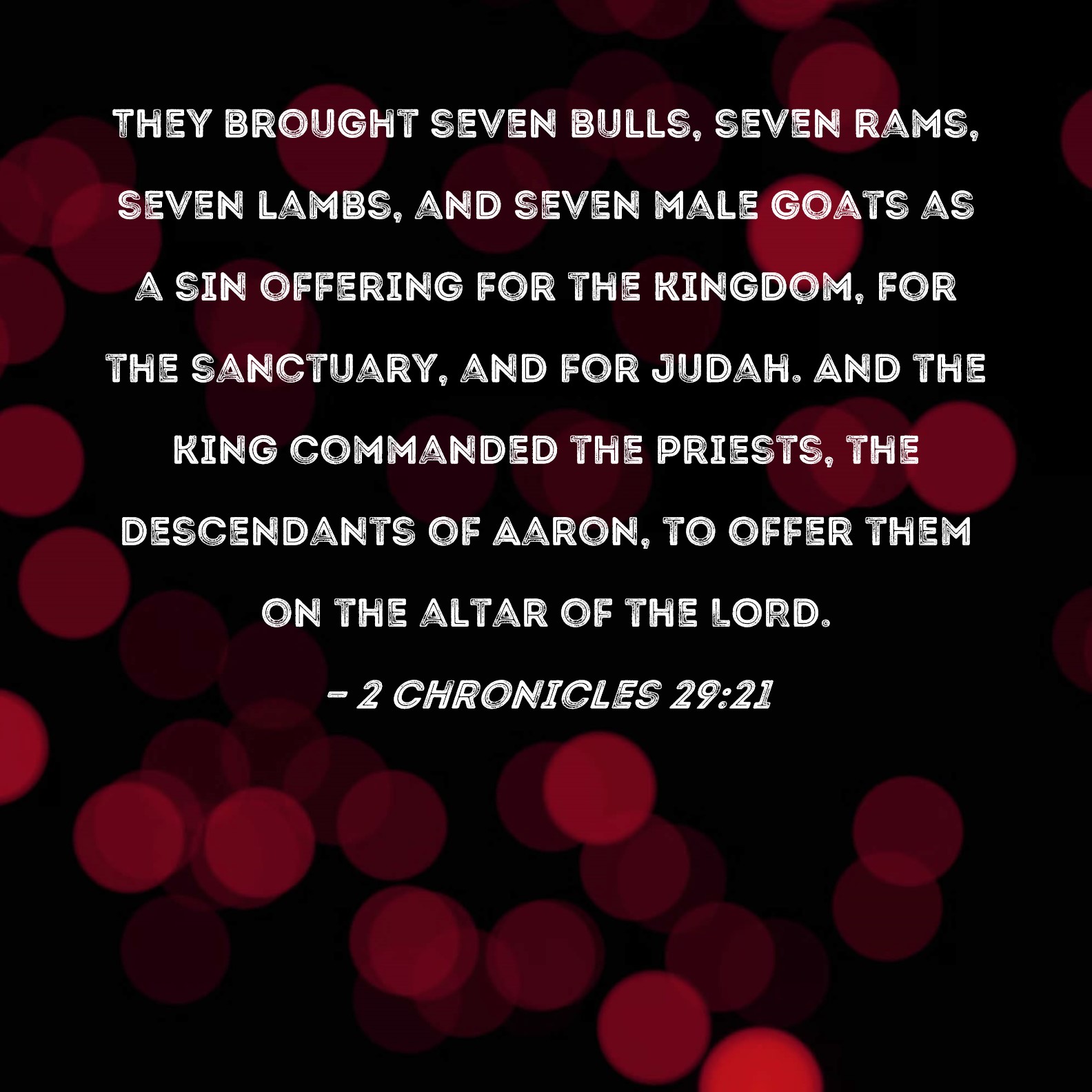 2 Chronicles 29:21 They brought seven bulls, seven rams, seven lambs, and seven male goats as a sin offering for the kingdom, for the sanctuary, and for Judah. And the king commanded the priests, the descendants of Aaron, to offer them on the altar of the LORD.