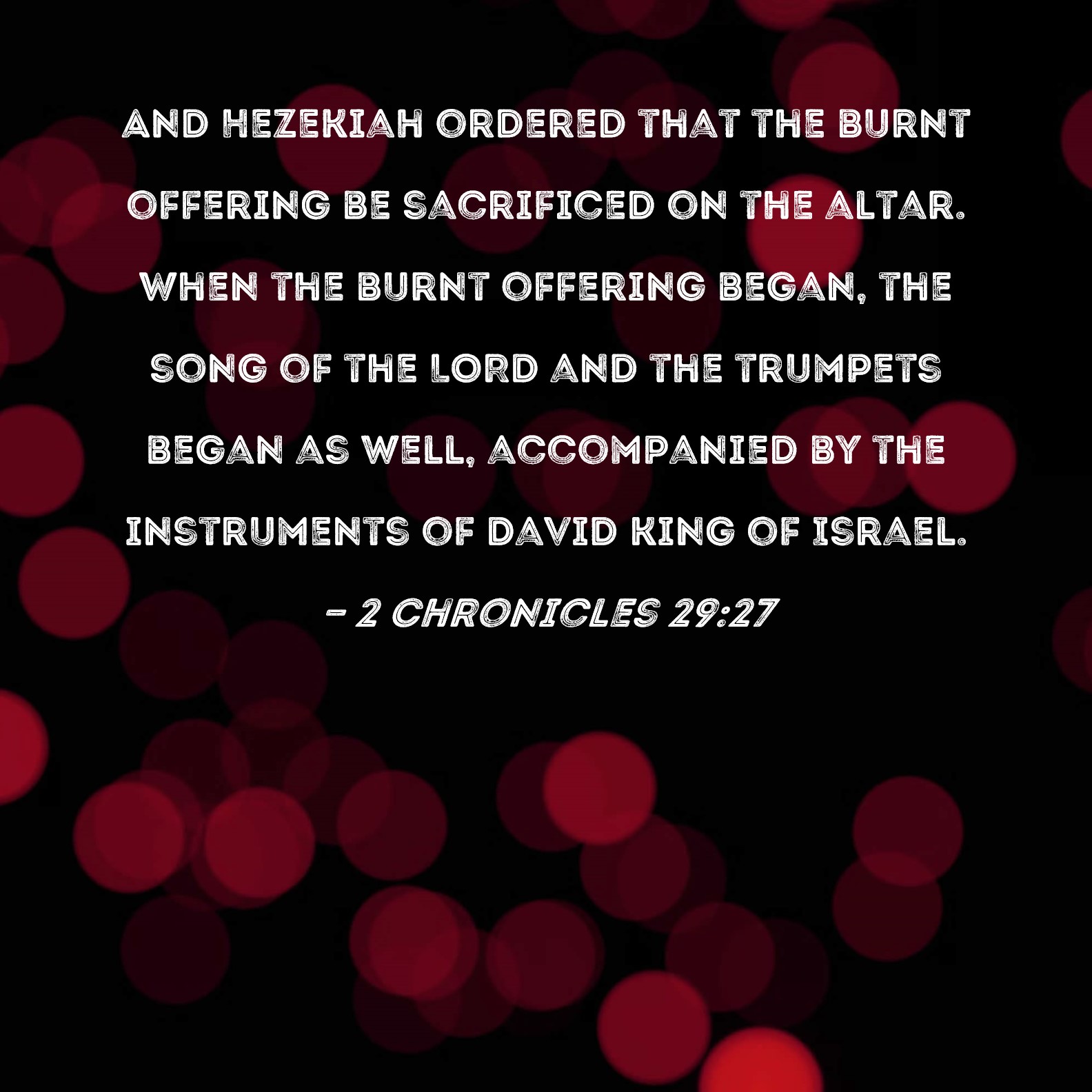 2 Chronicles 29:27 And Hezekiah ordered that the burnt offering be sacrificed on the altar. When the burnt offering began, the song of the LORD and the trumpets began as well, accompanied by the instruments of David king of Israel.