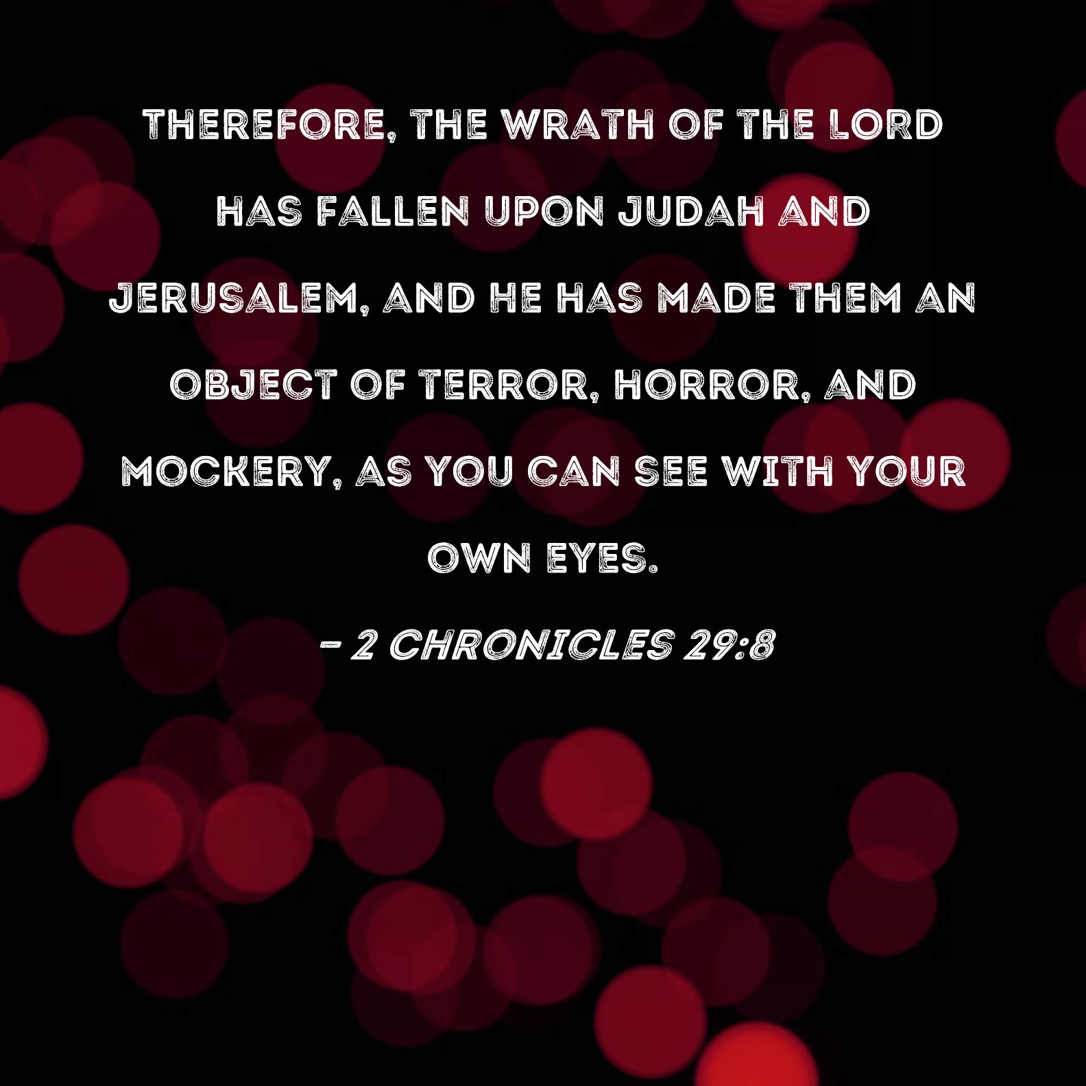 2 Chronicles 29:8 Therefore, the wrath of the LORD has fallen upon Judah and Jerusalem, and He has made them an object of terror, horror, and mockery, as you can see with your own eyes.