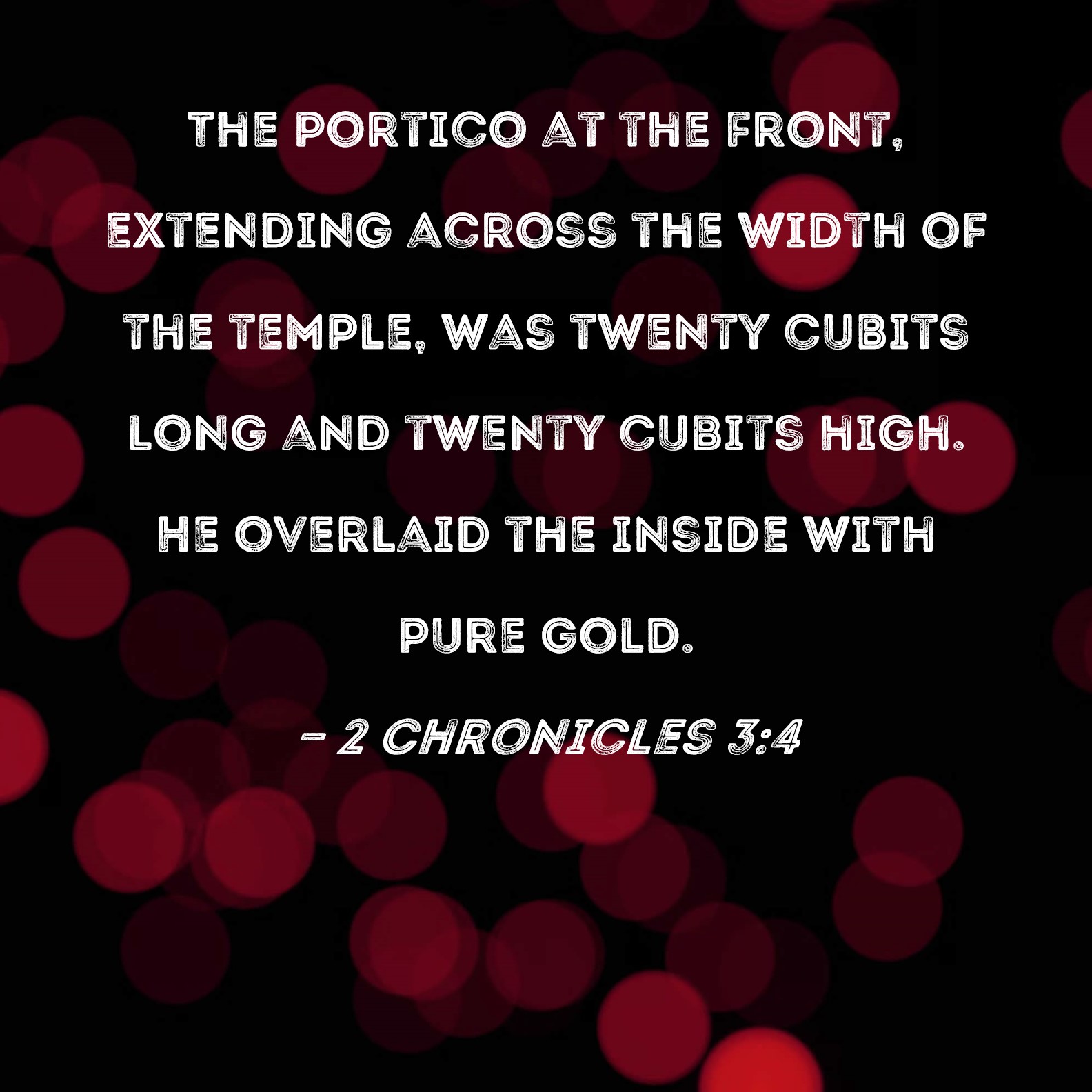 2 Chronicles 3:4 The portico at the front, extending across the width of the temple, was twenty cubits long and twenty cubits high. He overlaid the inside with pure gold.