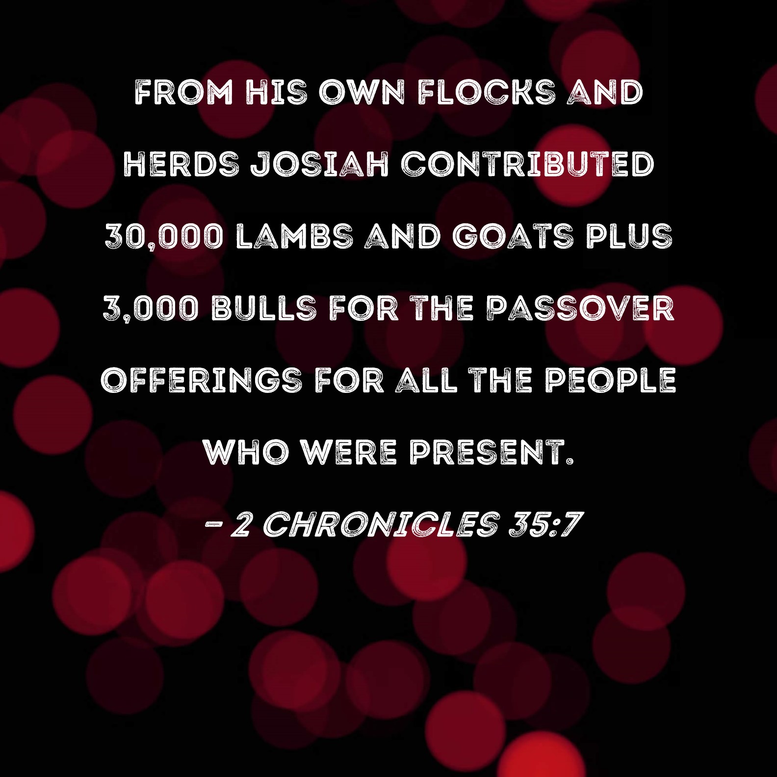 2 Chronicles 35:7 From his own flocks and herds Josiah contributed 30,000 lambs and goats plus 3,000 bulls for the Passover offerings for all the people who were present.