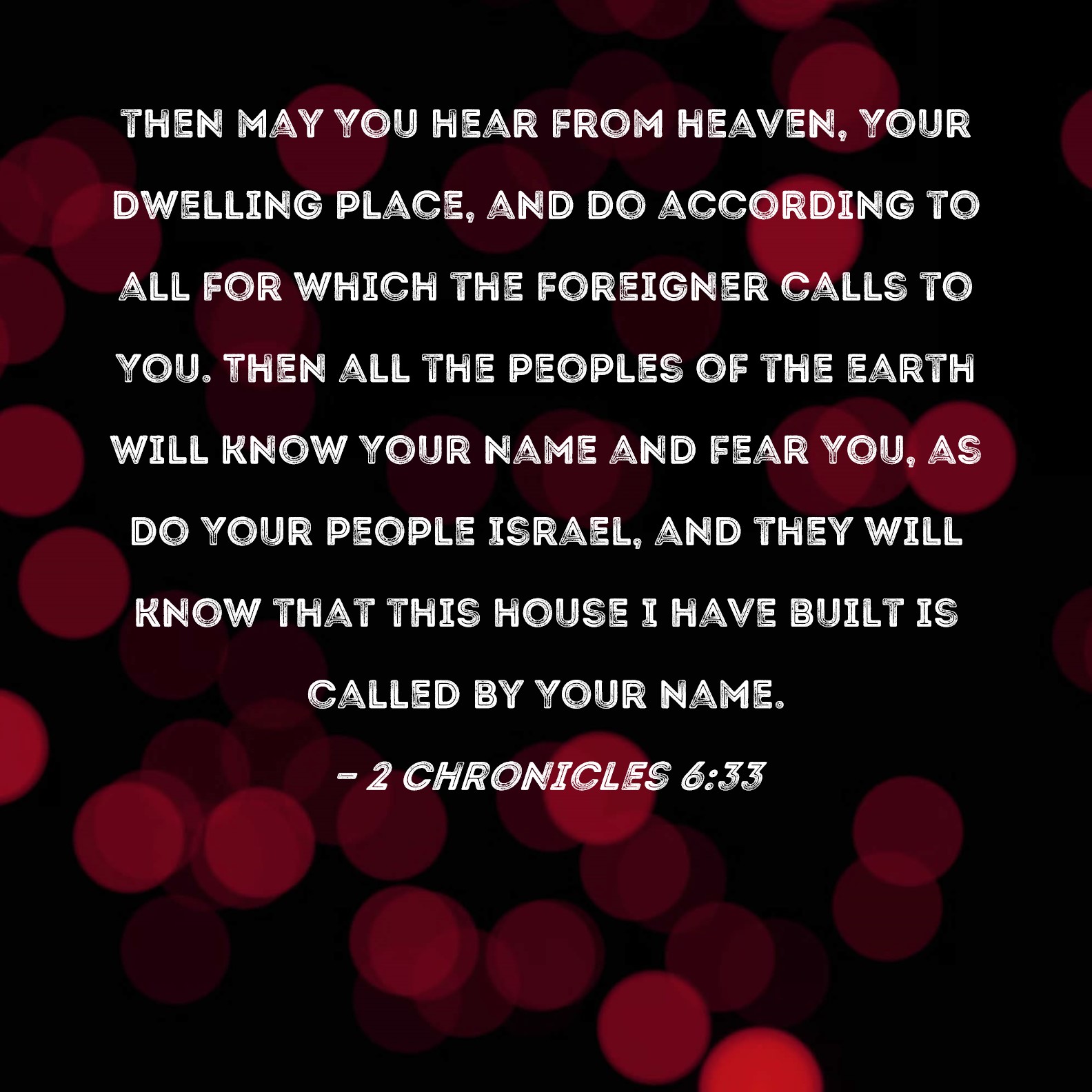 2 Chronicles 6:33 then may You hear from heaven, Your dwelling place, and do according to all for which the foreigner calls to You. Then all the peoples of the earth will know Your name and fear You, as do Your people Israel, and they will know that this house I have built is called by Your Name.