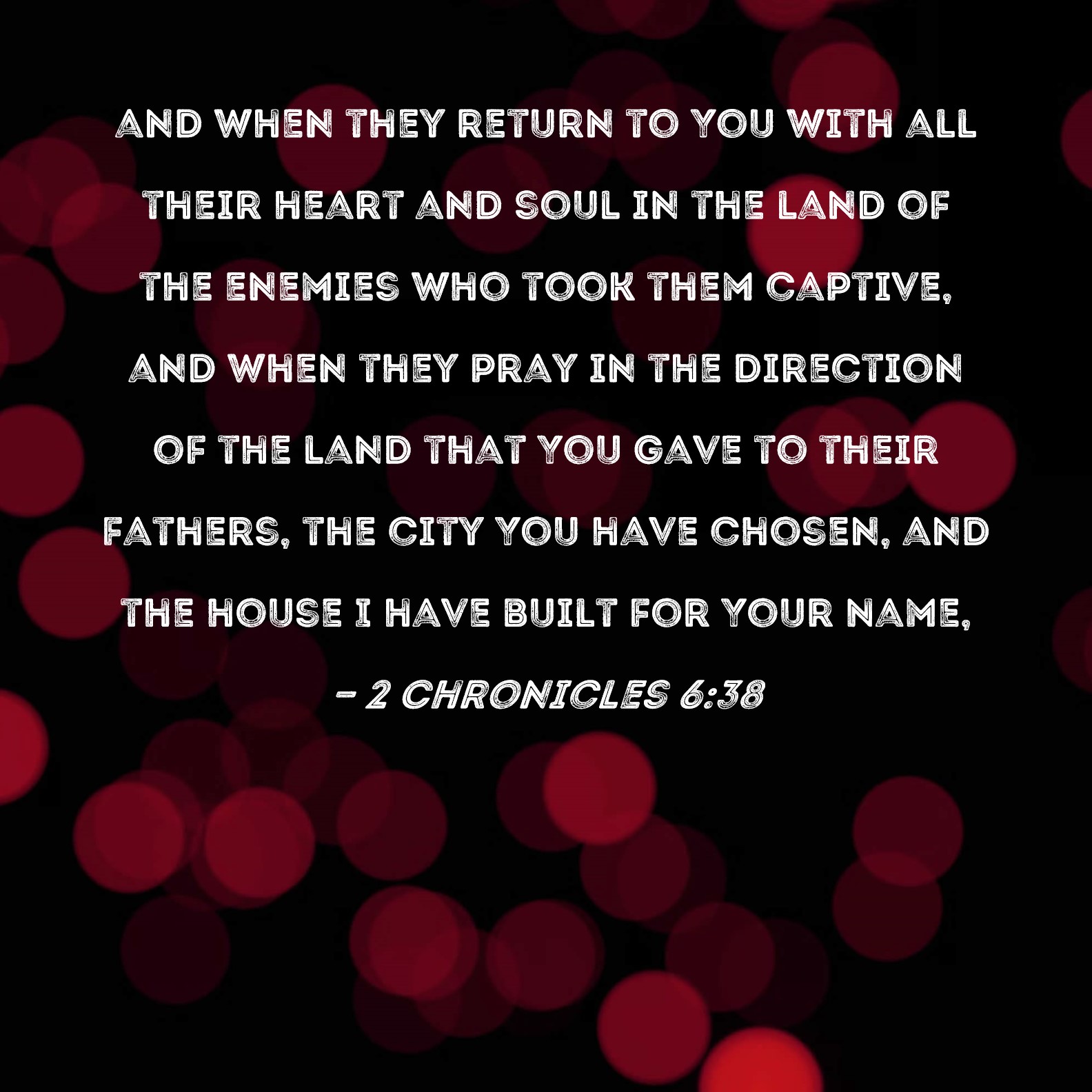 BSB: and when they return to You with all their heart and soul in the land of the enemies who took them captive, and when they pray in the direction of the land that You gave to their fathers, the city You have chosen, and the house I have built for Your Name, KJV: If they return to thee with all their heart and with all their soul in the land of their captivity, whither they have carried them captives, and pray toward their land, which thou gavest unto their fathers, and toward the city which thou hast chosen, and toward the house which I have built for thy name: DRB: And return to thee with all their heart, and with all their soul, in the land of their captivity, to which they were led away, and adore thee towards the way of their own land which thou gavest their fathers, and of the city, which thou hast chosen, and the house which I have built to thy name: DBT: and if they return unto thee with all their heart and with all their soul in the land of their captivity, whither they have carried them captives, and pray toward their land which thou gavest unto their fathers, and the city that thou hast chosen, and the house that I have built unto thy name; ERV: if they return unto thee with all their heart and with all their soul in the land of their captivity, whither they have carried them captive, and pray toward their land, which thou gavest unto their fathers, and the city which thou hast chosen, and toward the house which I have built for thy name: WBT: If they return to thee with all their heart and with all their soul in the land of their captivity, whither they have carried them captives, and pray towards their land which thou gavest to their fathers, and towards the city which thou hast chosen, and towards the house which I have built for thy name: WEB: if they return to you with all their heart and with all their soul in the land of their captivity, where they have been taken captive, and pray toward their land which you gave to their fathers, and the city which you have chosen, and toward the house which I have built for your name; YLT: yea, they have turned back unto Thee with all their heart, and with all their soul, in the land of their captivity, whither they have taken them captive, and they have prayed the way of their land that Thou hast given to their fathers, and of the city that Thou hast chosen, and of the house that I have built for Thy name:Links 2 Chronicles 6:38 NIV • 2 Chronicles 6:38 NLT • 2 Chronicles 6:38 ESV • 2 Chronicles 6:38 NASB • 2 Chronicles 6:38 KJV • 2 Chronicles 6:38 Interlinear • 2 Chronicles 6:38 Commentaries • 2 Chronicles 6:38 Parallel Texts • 2 Chronicles 6:38 Bible Apps • 2 Chronicles 6:38 Parallel • Bible Hub |