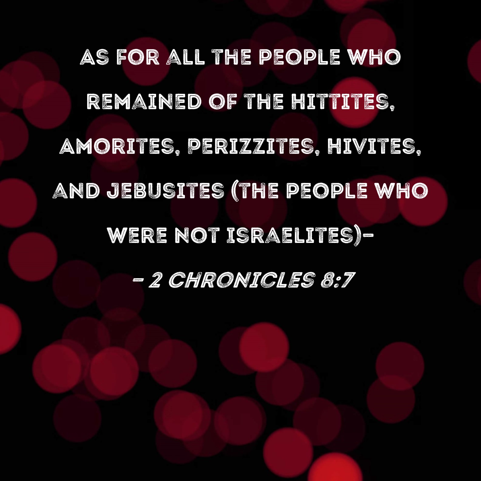 BSB: As for all the people who remained of the Hittites, Amorites, Perizzites, Hivites, and Jebusites (the people who were not Israelites)-- KJV: As for all the people that were left of the Hittites, and the Amorites, and the Perizzites, and the Hivites, and the Jebusites, which were not of Israel, DRB: All the people that were left of the Hethites, and the Amorrhites, and the Pherezites, and the Hevites, and the Jebusites, that were not of the stock of Israel: DBT: All the people that were left of the Hittites, and the Amorites, and the Perizzites, and the Hivites, and the Jebusites, who were not of Israel, ERV: As for all the people that were left of the Hittites, and the Amorites, and the Perizzites, and the Hivites, and the Jebusites, which were not of Israel; WBT: As for all the people that were left of the Hittites, and the Amorites, and the Perizzites, and the Hivites, and the Jebusites, who were not of Israel, WEB: As for all the people who were left of the Hittites, the Amorites, the Perizzites, the Hivites, and the Jebusites, who were not of Israel— YLT: All the people who are left of the Hittite, and the Amorite, and the Perizzite, and the Hivite, and the Jebusite, who are not of Israel — Links 2 Chronicles 8:7 NIV • 2 Chronicles 8:7 NLT • 2 Chronicles 8:7 ESV • 2 Chronicles 8:7 NASB • 2 Chronicles 8:7 KJV • 2 Chronicles 8:7 Interlinear • 2 Chronicles 8:7 Commentaries • 2 Chronicles 8:7 Parallel Texts • 2 Chronicles 8:7 Bible Apps • 2 Chronicles 8:7 Parallel • Bible Hub |