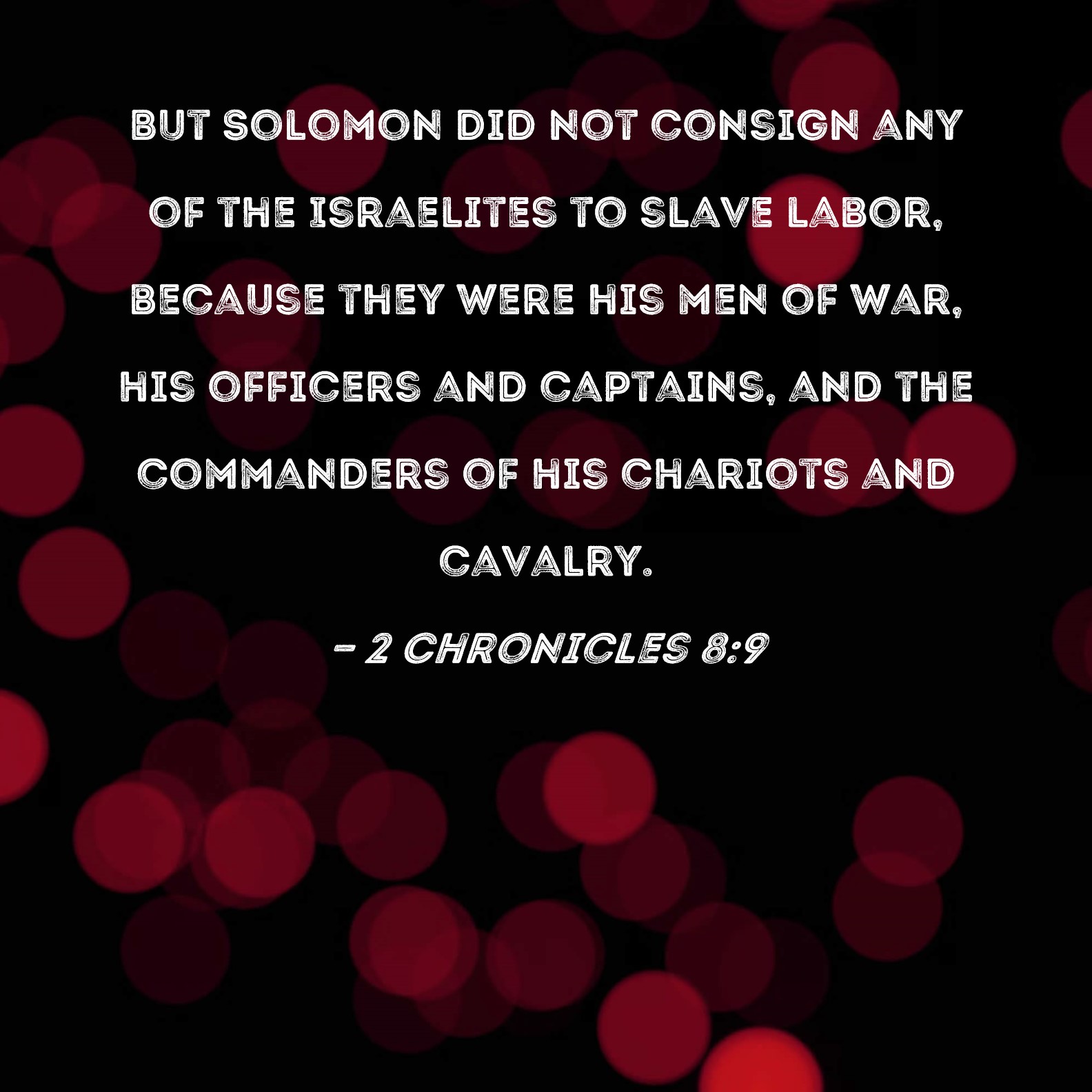 2 Chronicles 8:9 But Solomon did not consign any of the Israelites to slave labor, because they were his men of war, his officers and captains, and the commanders of his chariots and cavalry.