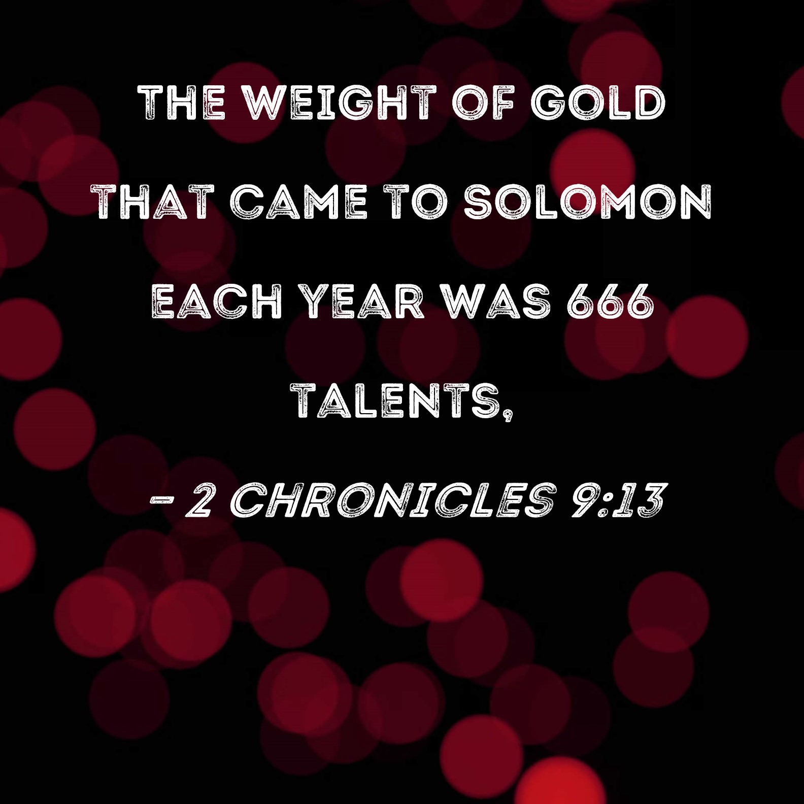 2 Chronicles 9:13 The weight of gold that came to Solomon each year was 666 talents,