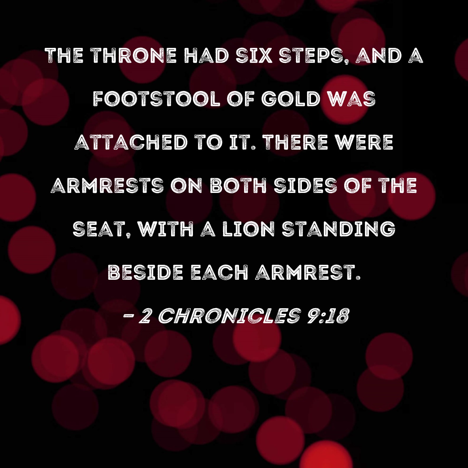2 Chronicles 9:18 The throne had six steps, and a footstool of gold was attached to it. There were armrests on both sides of the seat, with a lion standing beside each armrest.