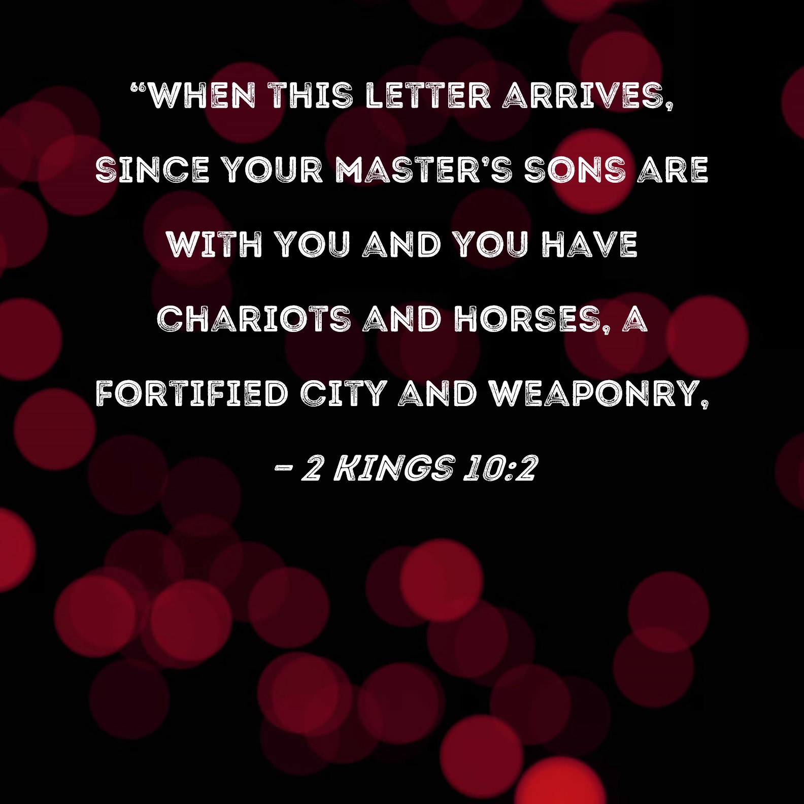2 Kings 10:2 "When this letter arrives, since your master's sons are with you and you have chariots and horses, a fortified city and weaponry,