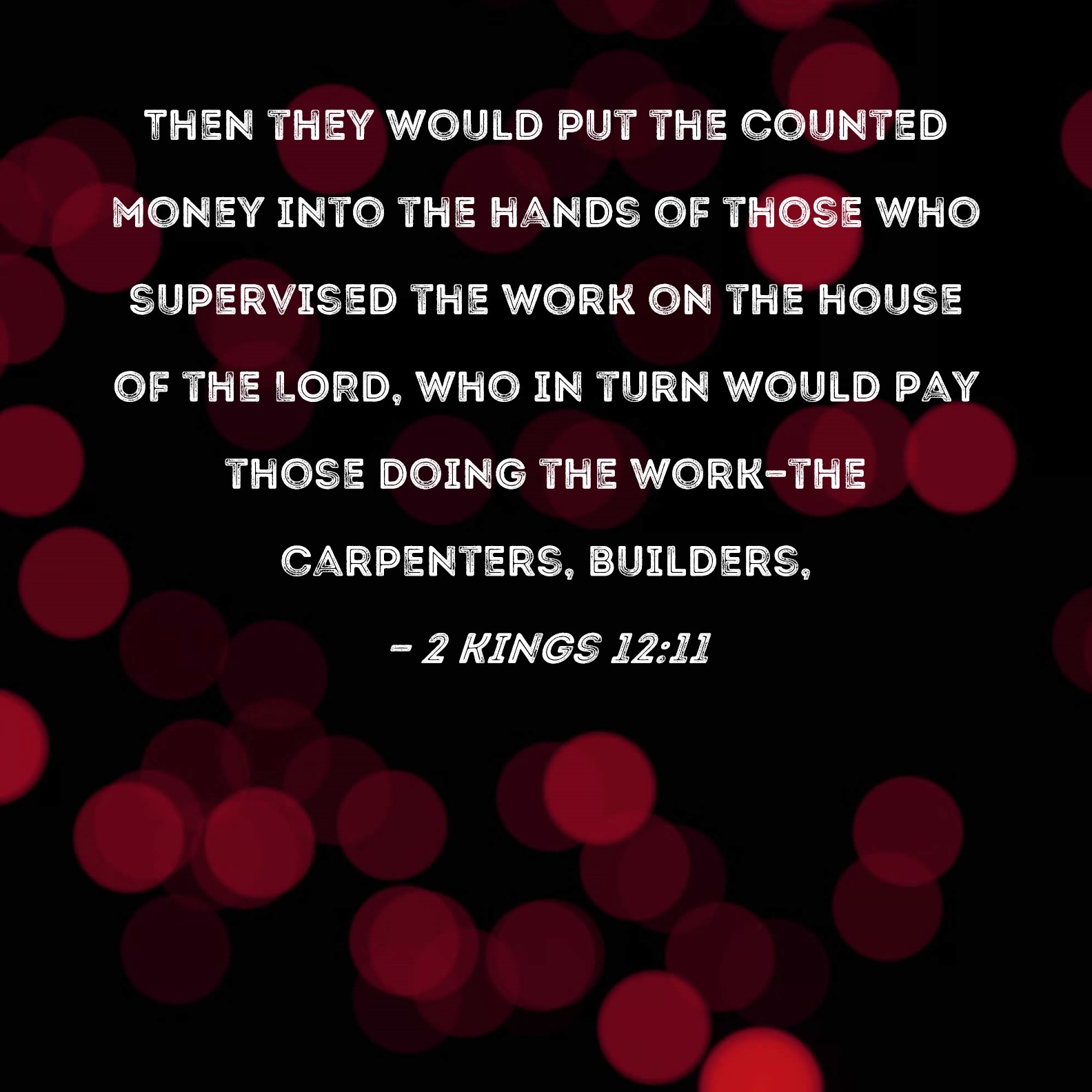 2 Kings 12:11 Then they would put the counted money into the hands of those who supervised the work on the house of the LORD, who in turn would pay those doing the work--the carpenters, builders,