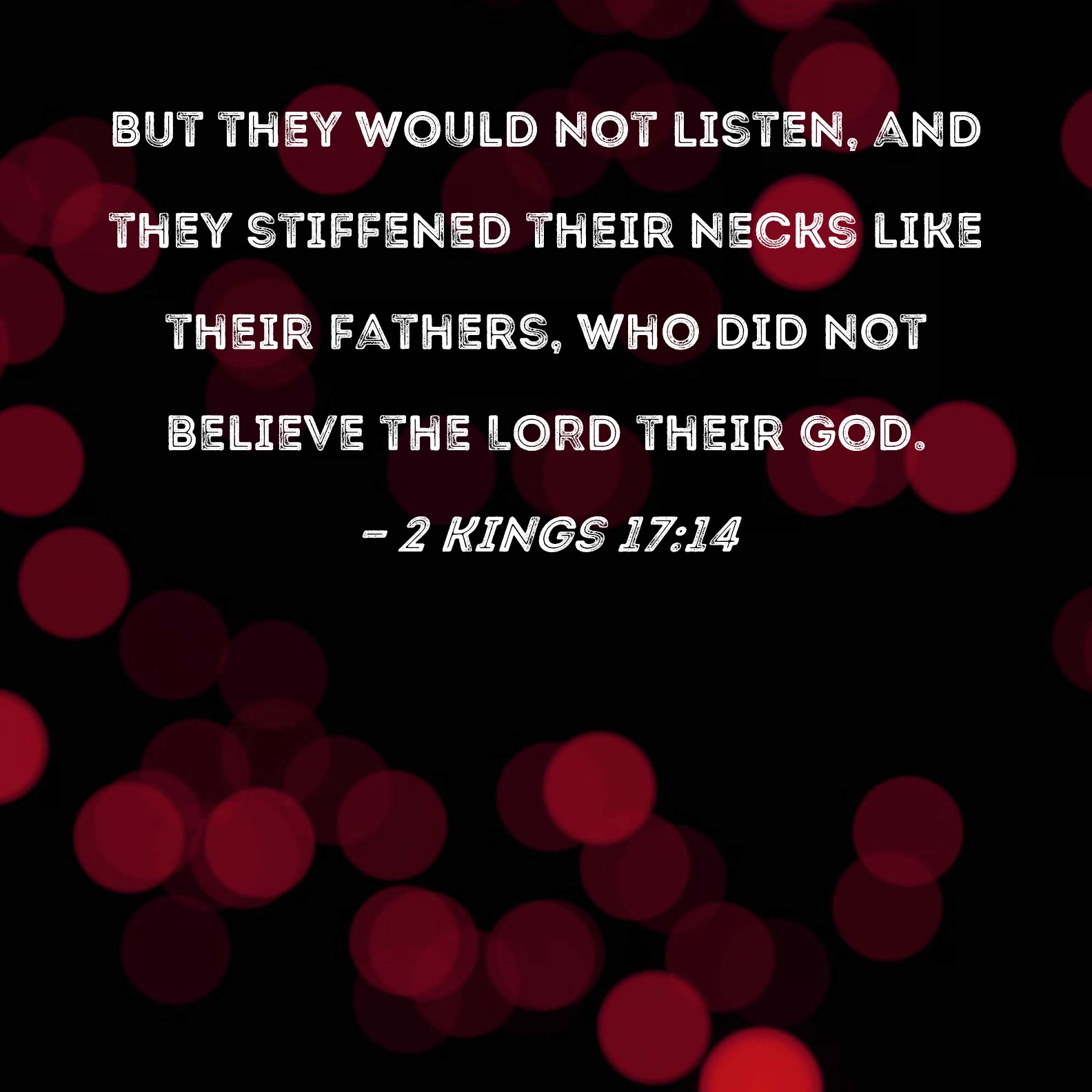 2 Kings 17:14 But they would not listen, and they stiffened their necks like their fathers, who did not believe the LORD their God.