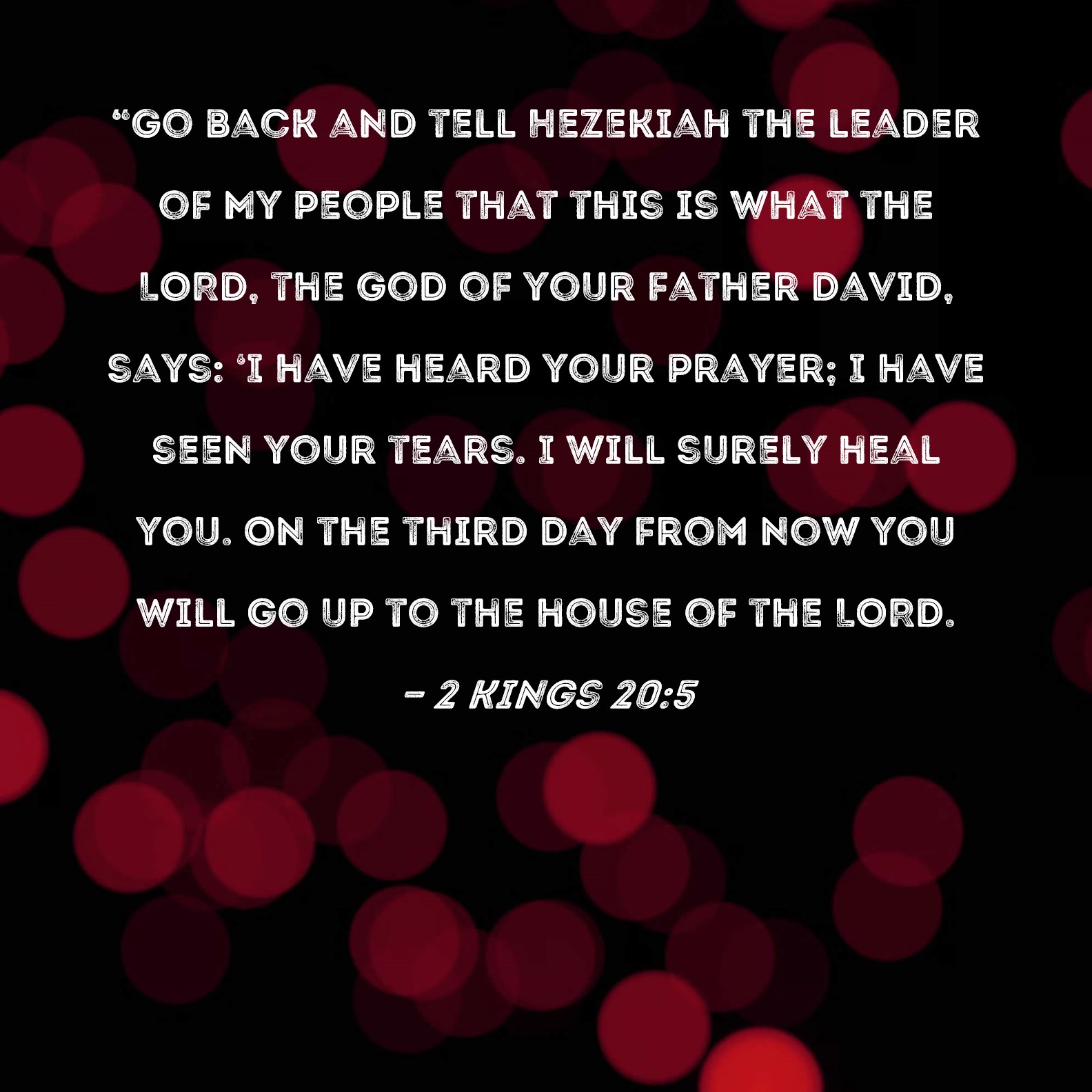 2 Kings 20:5 "Go back and tell Hezekiah the leader of My people that this is what the LORD, the God of your father David, says: 'I have heard your prayer; I have seen your tears. I will surely heal you. On the third day from now you will go up to the house of the LORD.