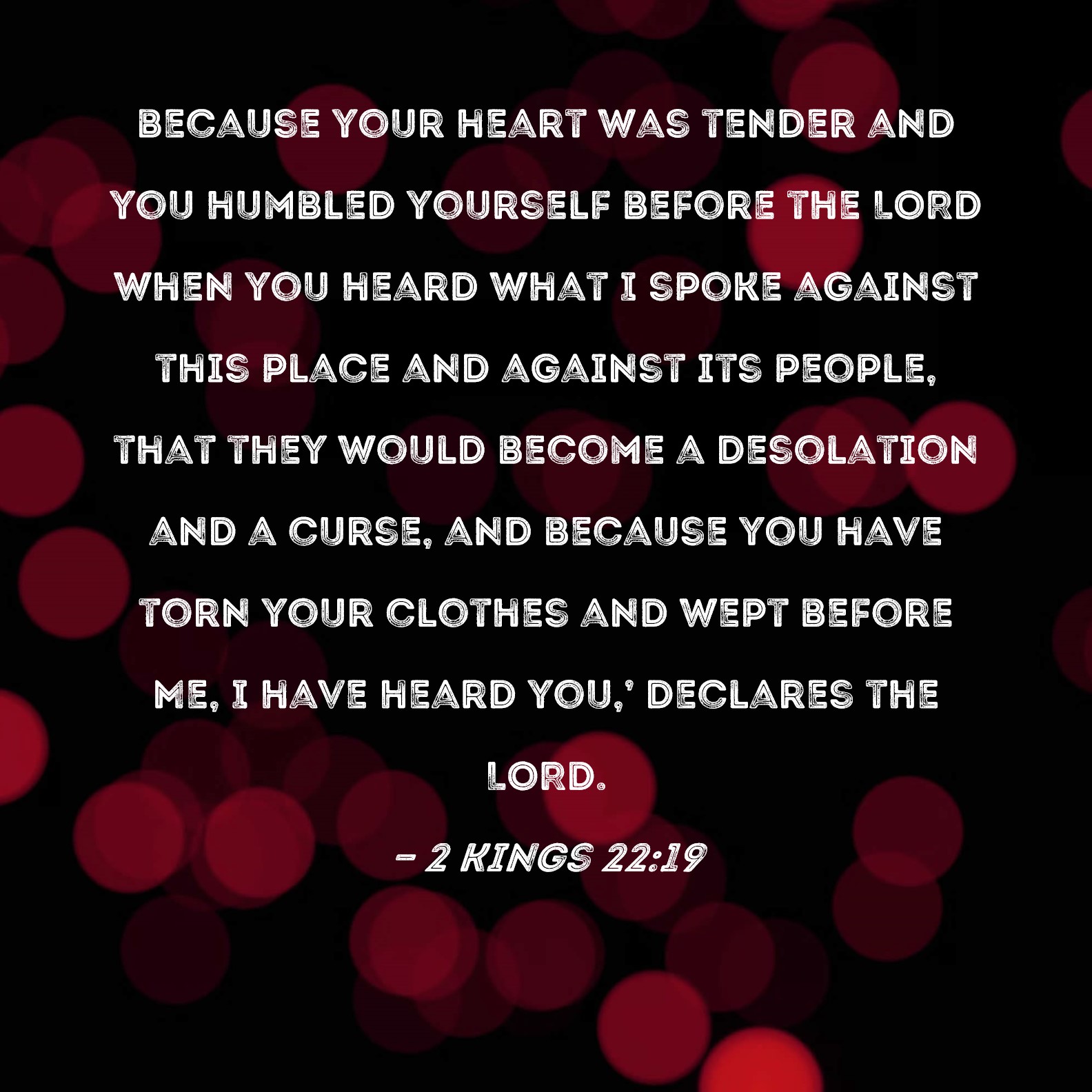2 Kings 22:19 because your heart was tender and you humbled yourself before the LORD when you heard what I spoke against this place and against its people, that they would become a desolation and a curse, and because you have torn your clothes and wept before Me, I have heard you,' declares the LORD.