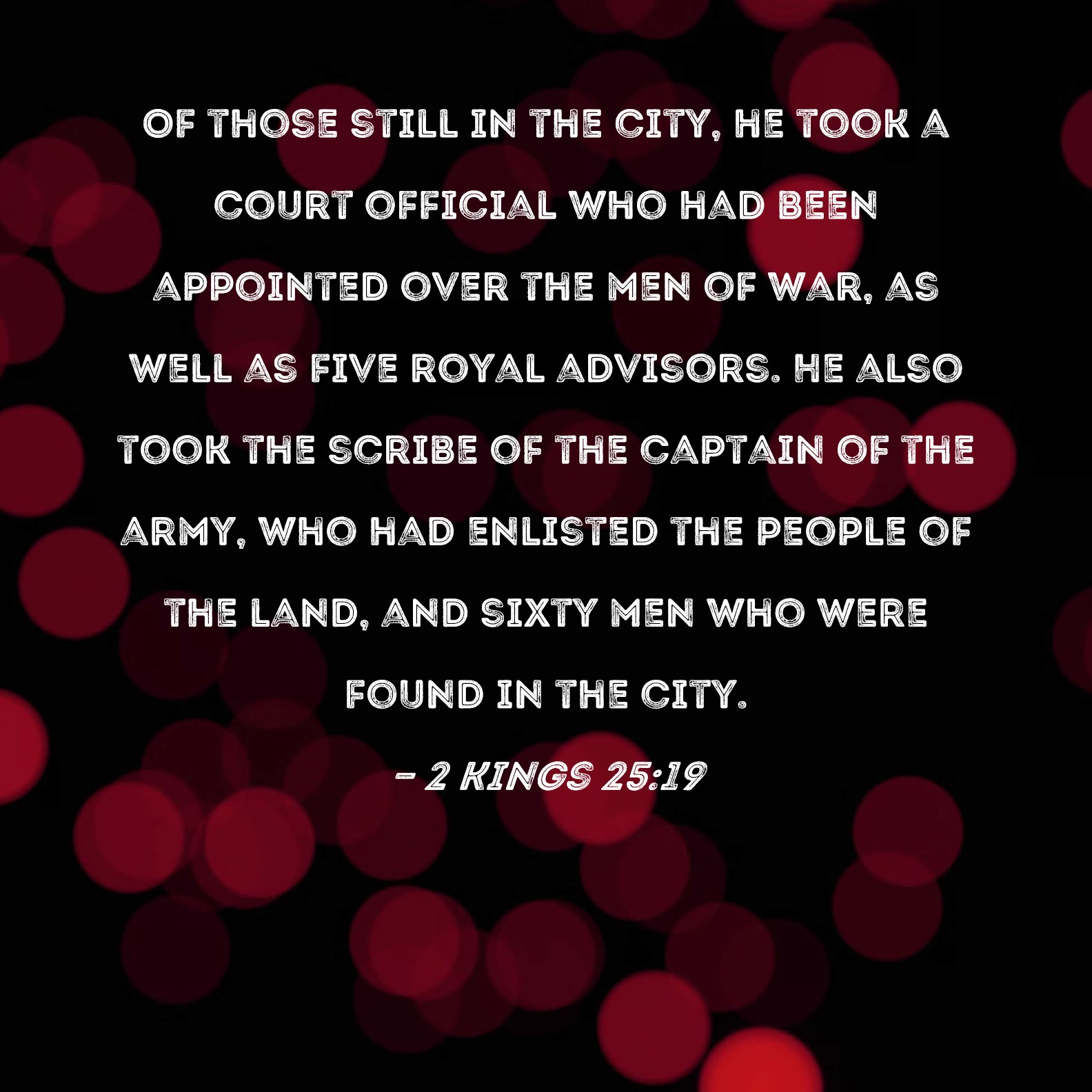 2 Kings 25:19 Of those still in the city, he took a court official who had been appointed over the men of war, as well as five royal advisors. He also took the scribe of the captain of the army, who had enlisted the people of the land, and sixty men who were found in the city.