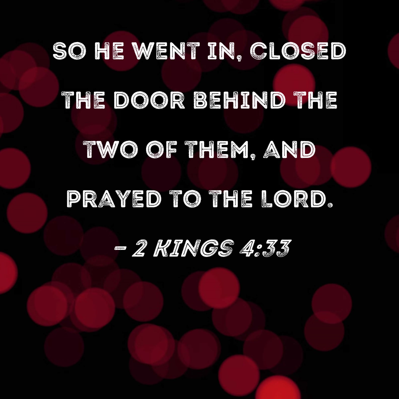 BSB: So he went in, closed the door behind the two of them, and prayed to the LORD. KJV: He went in therefore, and shut the door upon them twain, and prayed unto the LORD. DRB: And going in he shut the door upon him, and upon the child, and prayed to the Lord. DBT: And he went in and shut the door upon them both, and prayed to Jehovah. ERV: He went in therefore, and shut the door upon them twain, and prayed unto the LORD. WBT: He went in therefore, and shut the door upon them both, and prayed to the LORD. WEB: He went in therefore, and shut the door on them both, and prayed to Yahweh. YLT: and he goeth in and shutteth the door upon them both, and prayeth unto Jehovah.Links 2 Kings 4:33 NIV • 2 Kings 4:33 NLT • 2 Kings 4:33 ESV • 2 Kings 4:33 NASB • 2 Kings 4:33 KJV • 2 Kings 4:33 Interlinear • 2 Kings 4:33 Commentaries • 2 Kings 4:33 Parallel Texts • 2 Kings 4:33 Bible Apps • 2 Kings 4:33 Parallel • Bible Hub |