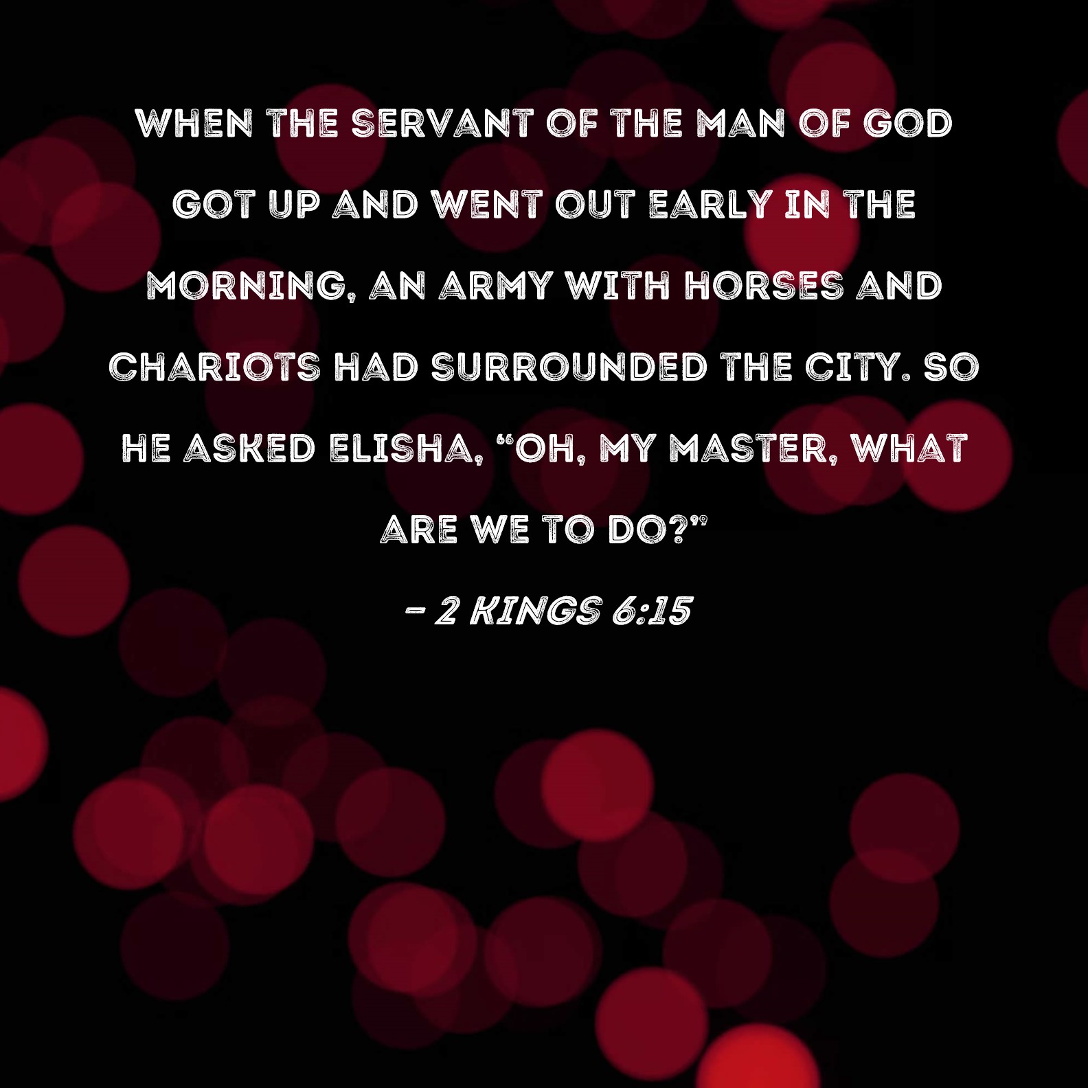 2 Kings 6:15 When the servant of the man of God got up and went out early in the morning, an army with horses and chariots had surrounded the city. So he asked Elisha, "Oh, my master, what are we to do?"