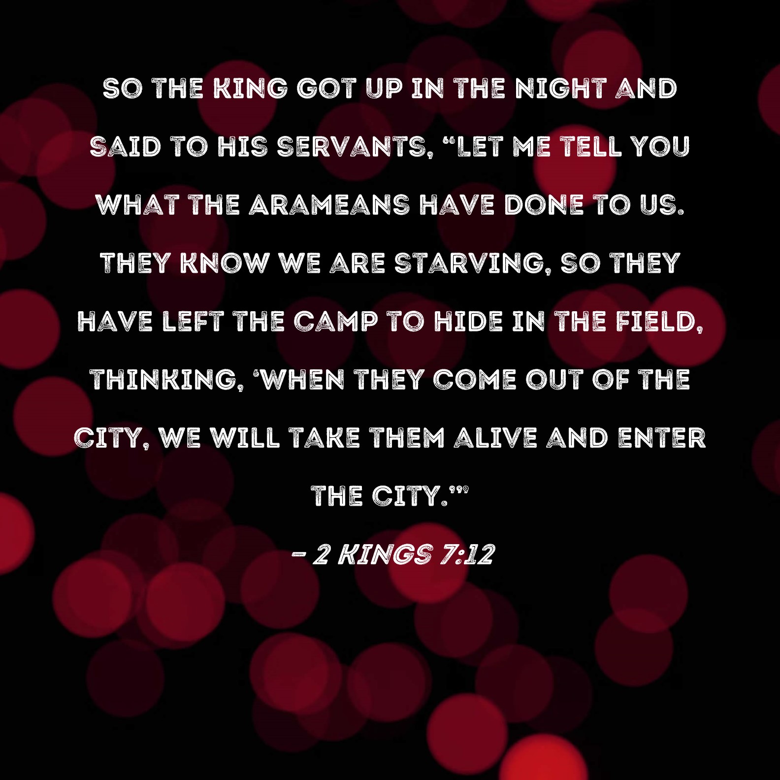 2 Kings 7:12 So the king got up in the night and said to his servants, "Let me tell you what the Arameans have done to us. They know we are starving, so they have left the camp to hide in the field, thinking, 'When they come out of the city, we will take them alive and enter the city.'"