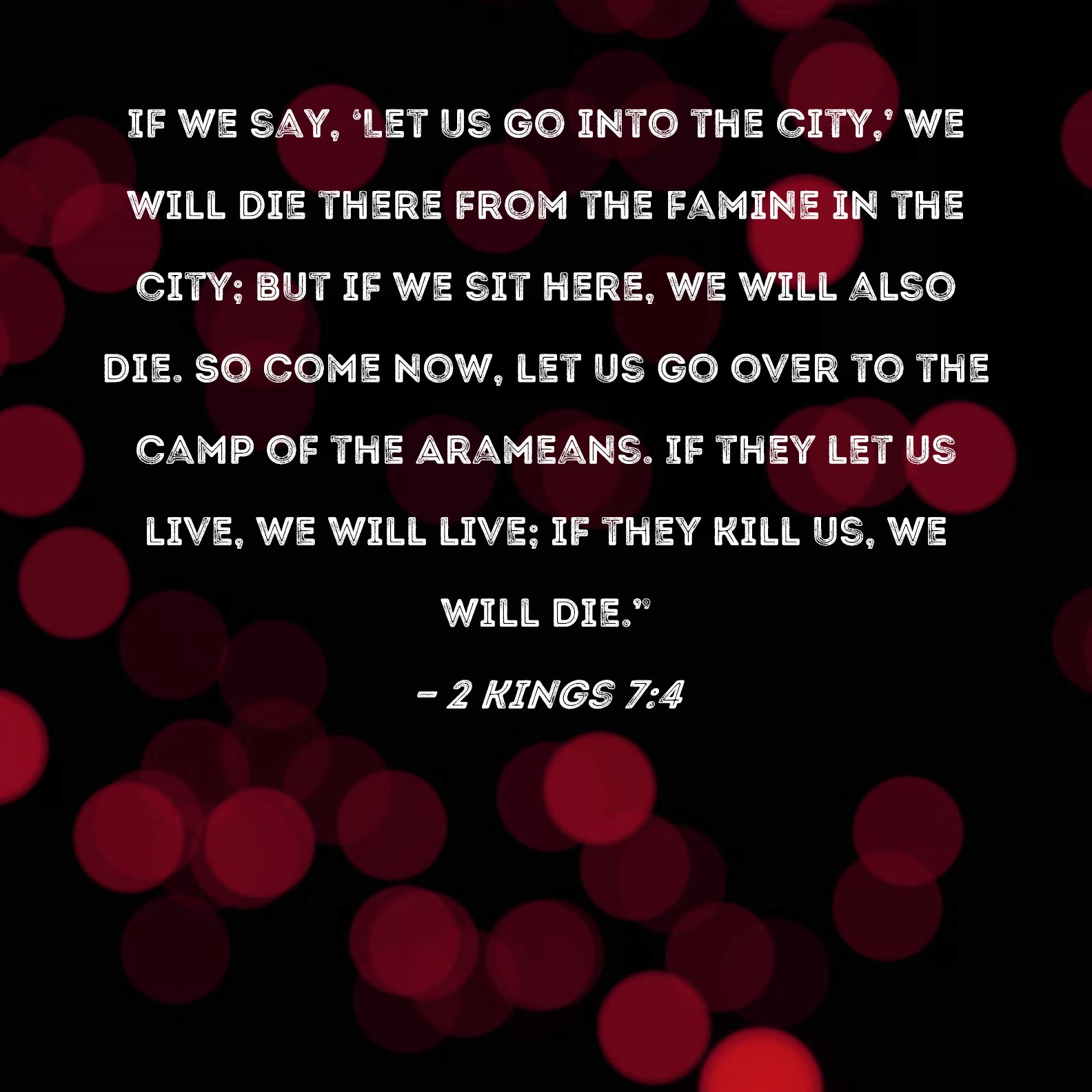 2 Kings 7:4 If we say, 'Let us go into the city,' we will die there from the famine in the city; but if we sit here, we will also die. So come now, let us go over to the camp of the Arameans. If they let us live, we will live; if they kill us, we will die."