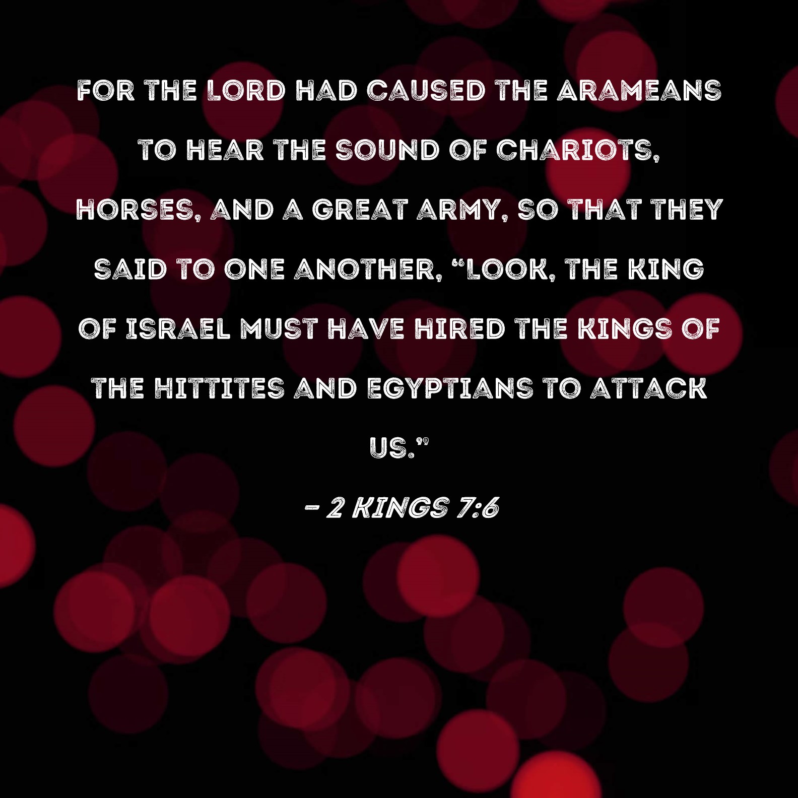 2 Kings 7:6 For the Lord had caused the Arameans to hear the sound of chariots, horses, and a great army, so that they said to one another, "Look, the king of Israel must have hired the kings of the Hittites and Egyptians to attack us."
