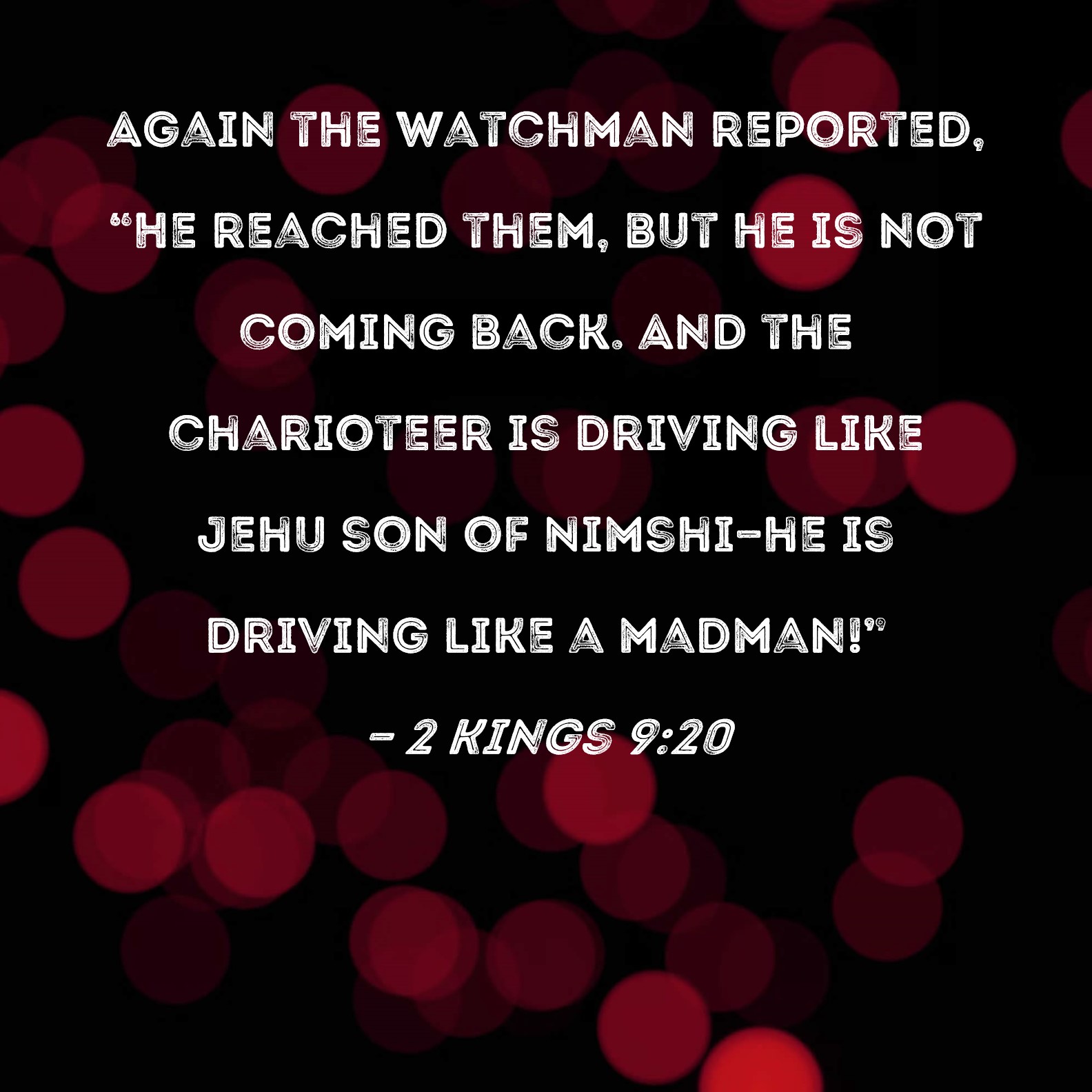 2 Kings 9:20 Again the watchman reported, "He reached them, but he is not coming back. And the charioteer is driving like Jehu son of Nimshi--he is driving like a madman!"