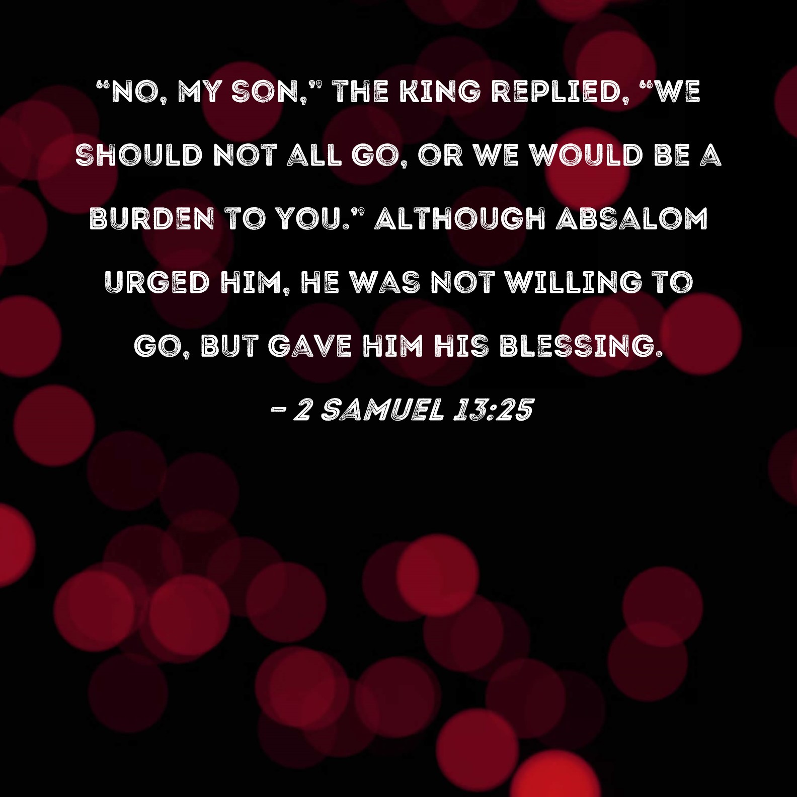 2 Samuel 13:25 "No, my son," the king replied, "we should not all go, or we would be a burden to you." Although Absalom urged him, he was not willing to go, but gave him his blessing.