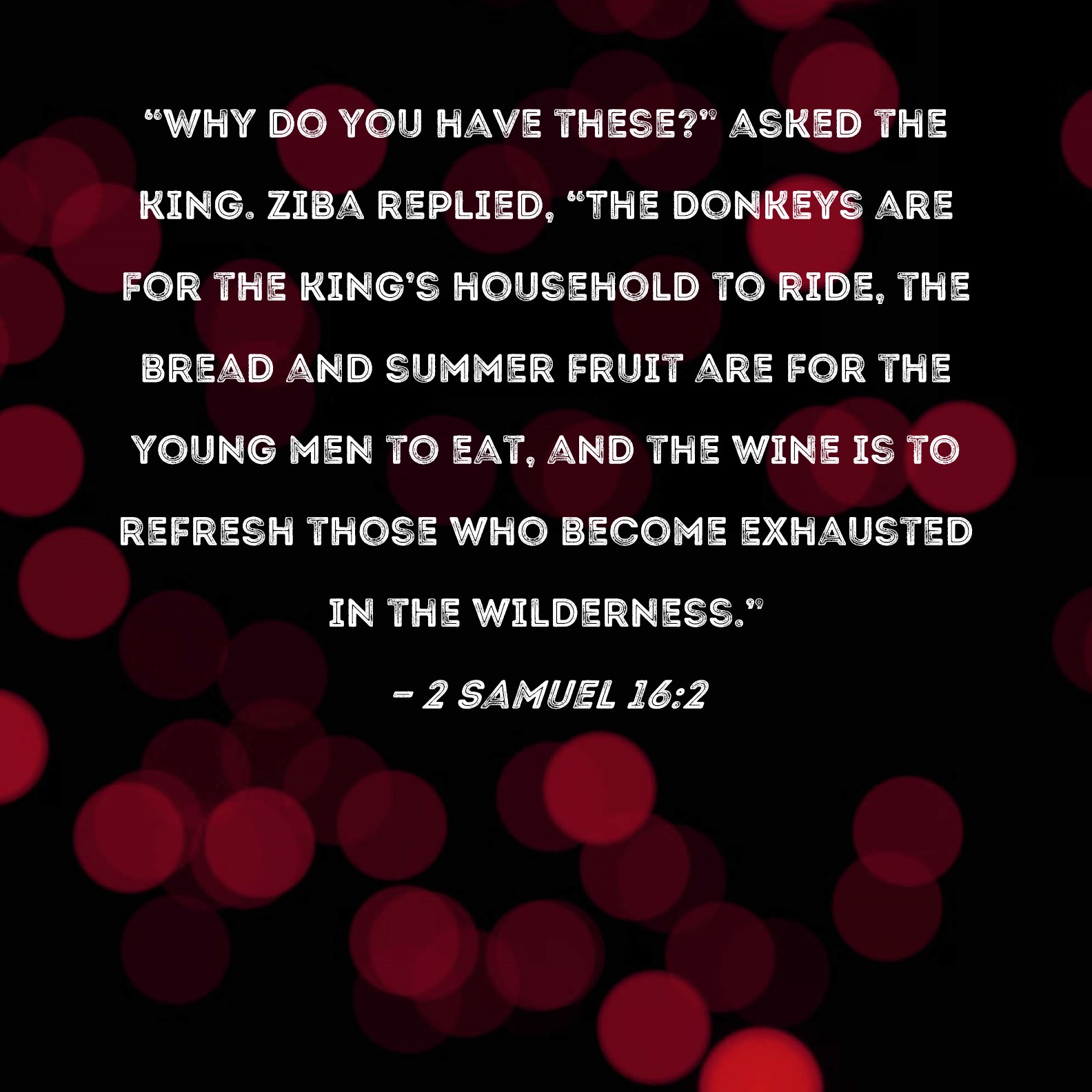 2 Samuel 16:2 "Why do you have these?" asked the king. Ziba replied, "The donkeys are for the king's household to ride, the bread and summer fruit are for the young men to eat, and the wine is to refresh those who become exhausted in the wilderness."