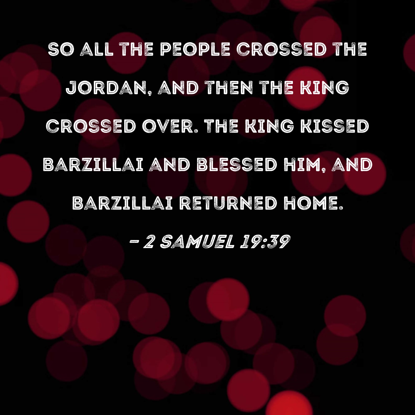 2 Samuel 19:39 So all the people crossed the Jordan, and then the king crossed over. The king kissed Barzillai and blessed him, and Barzillai returned home.
