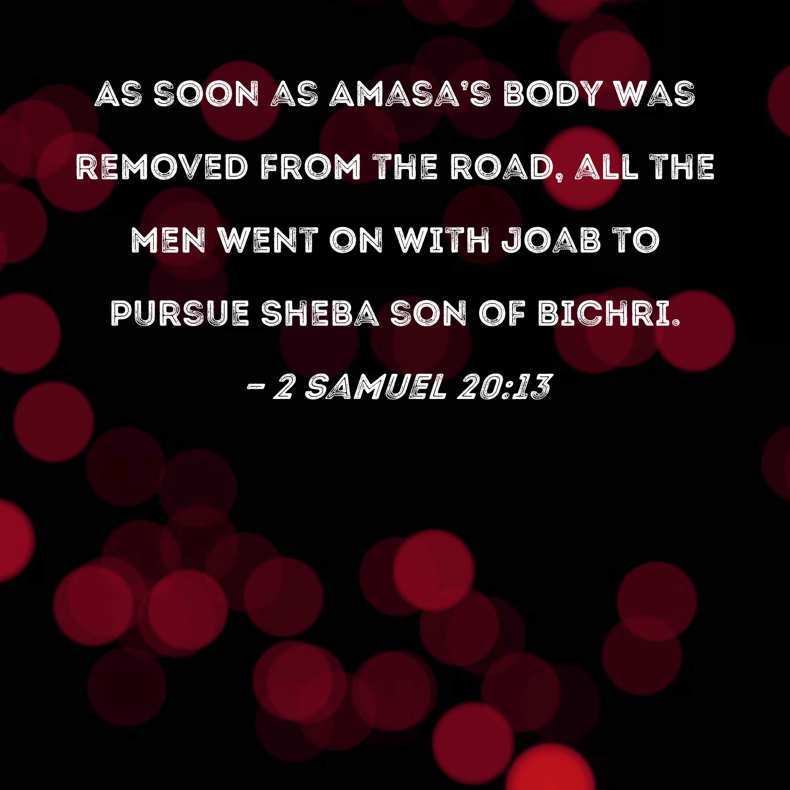 2 Samuel 20:13 As soon as Amasa's body was removed from the road, all the men went on with Joab to pursue Sheba son of Bichri.