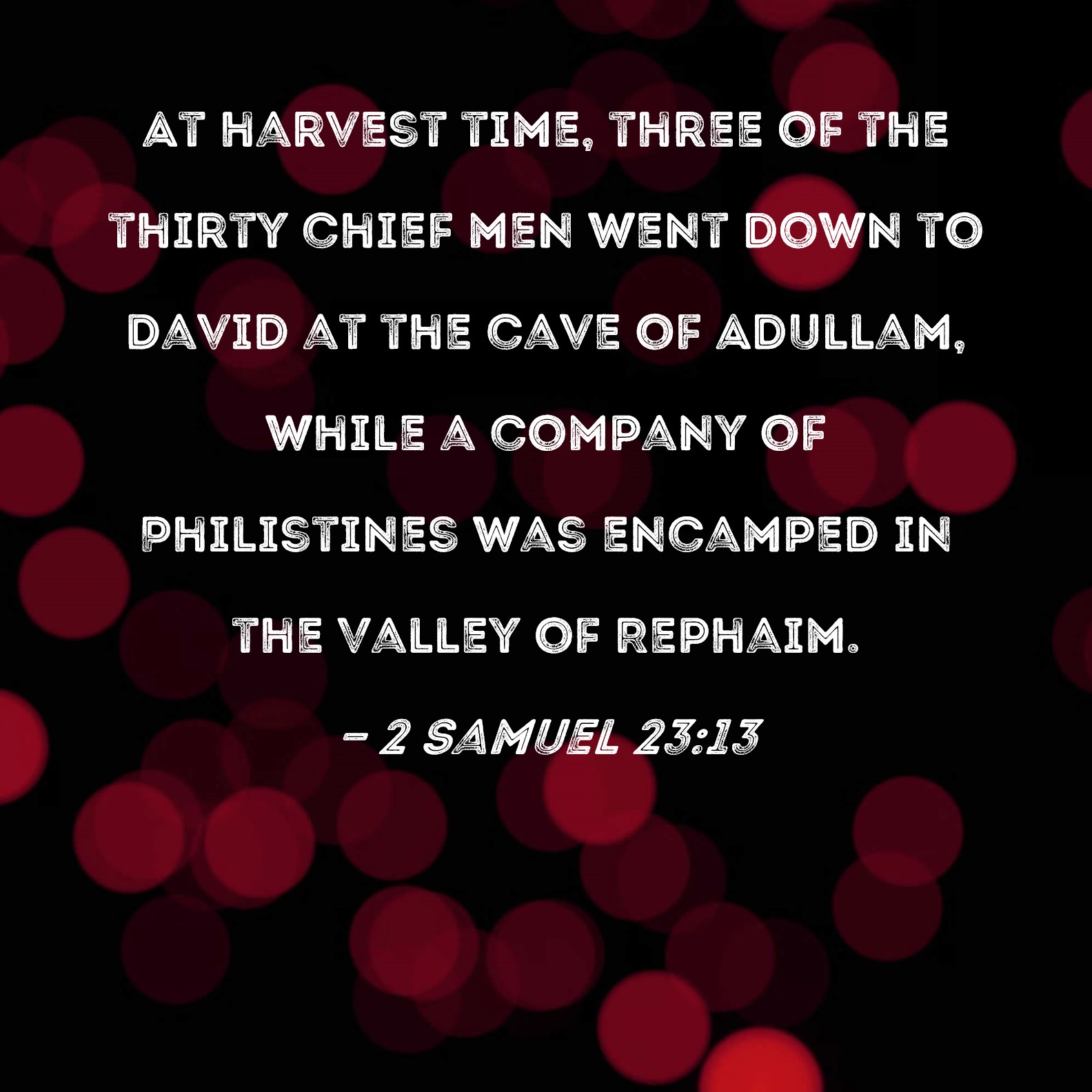 2 Samuel 23:13 At harvest time, three of the thirty chief men went down to David at the cave of Adullam, while a company of Philistines was encamped in the Valley of Rephaim.