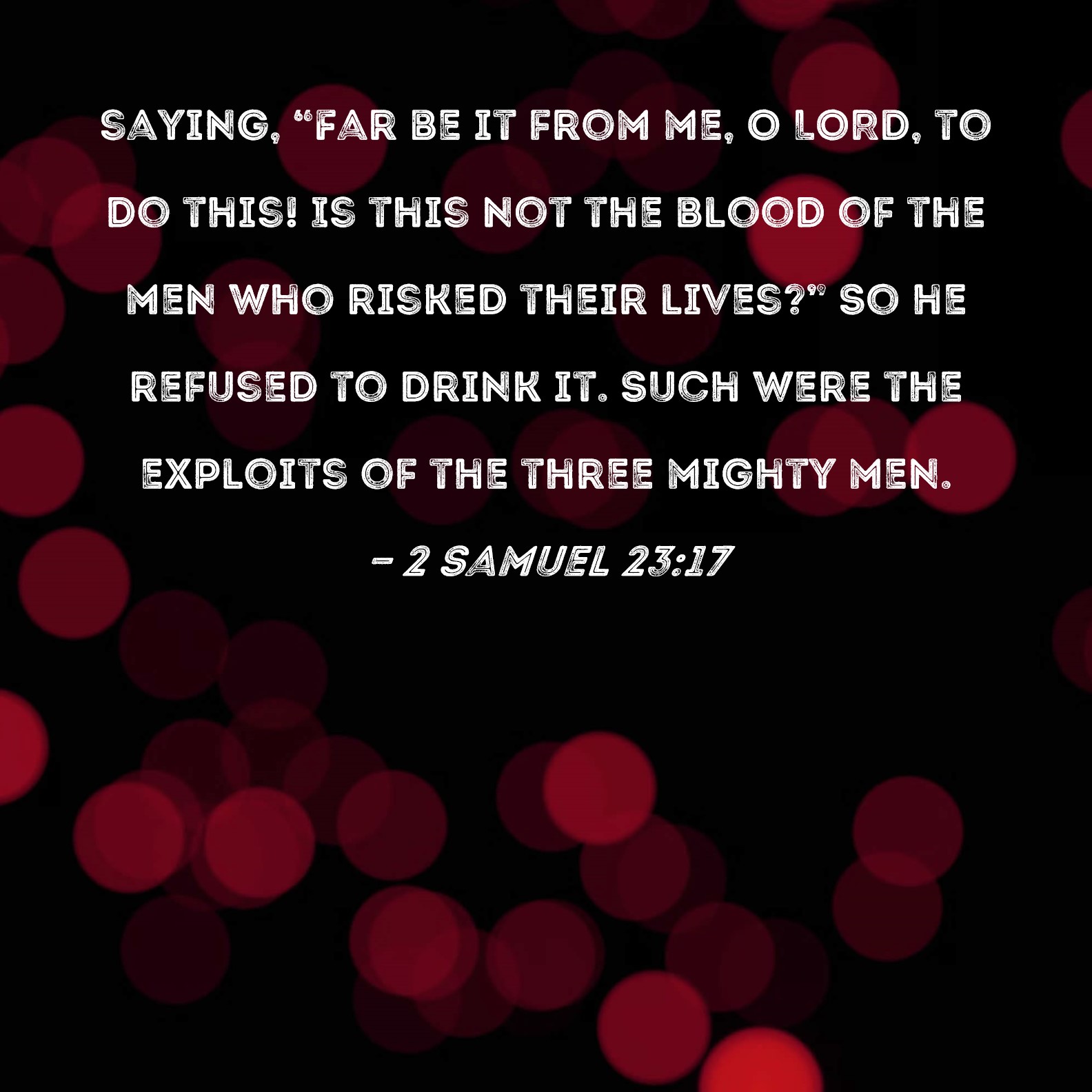 2 Samuel 23:17 saying, "Far be it from me, O LORD, to do this! Is this not the blood of the men who risked their lives?" So he refused to drink it. Such were the exploits of the three mighty men.