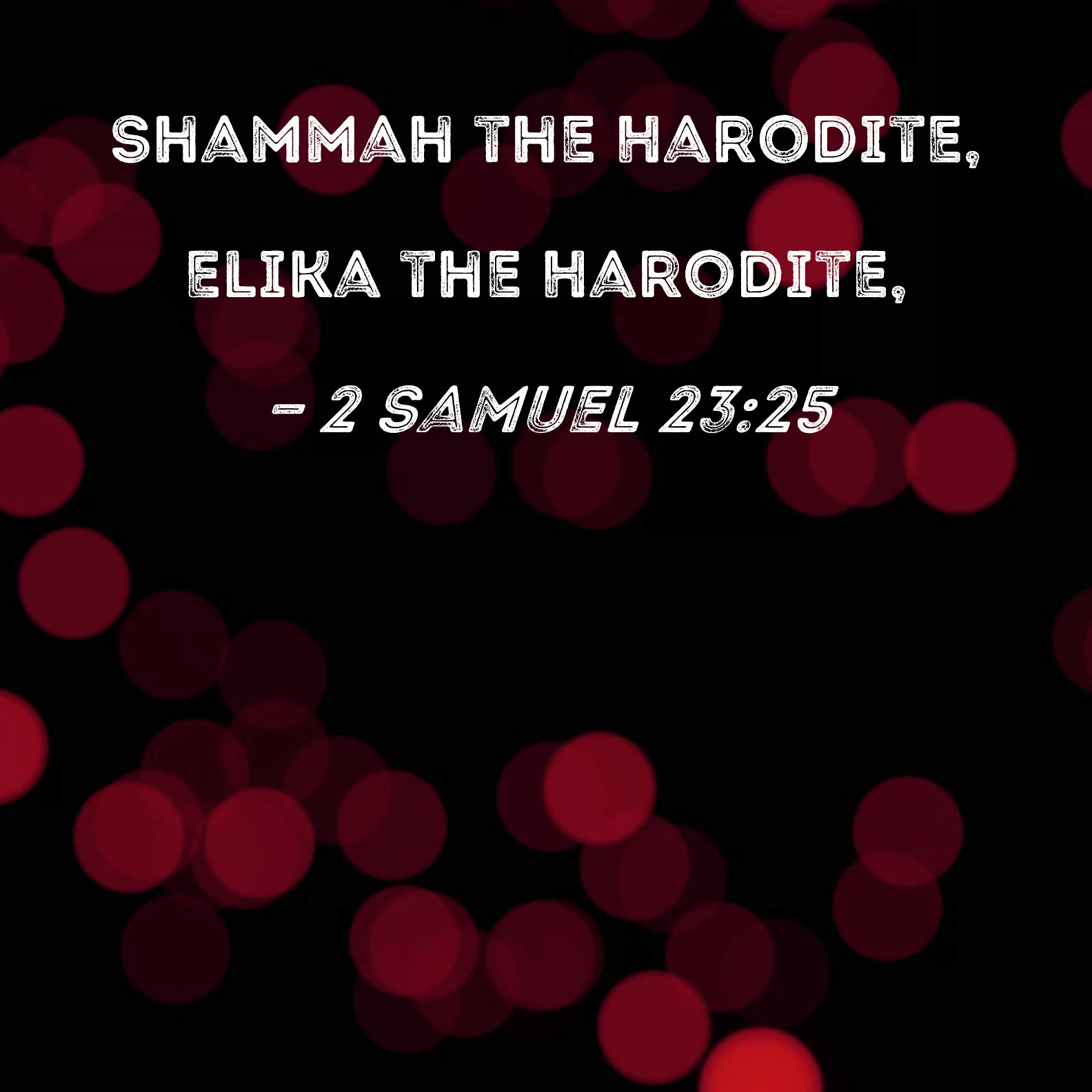 BSB: Shammah the Harodite, Elika the Harodite, KJV: Shammah the Harodite, Elika the Harodite, DRB: Semma of Harodi, Elica of Harodi, DBT: Shammah the Harodite, Elika the Harodite, ERV: Shammah the Harodite, Elika the Harodite; WBT: Shammah the Harodite, Elika the Harodite, WEB: Shammah the Harodite, Elika the Harodite, YLT: Shammah the Harodite, Elika the Harodite,Links 2 Samuel 23:25 NIV • 2 Samuel 23:25 NLT • 2 Samuel 23:25 ESV • 2 Samuel 23:25 NASB • 2 Samuel 23:25 KJV • 2 Samuel 23:25 Interlinear • 2 Samuel 23:25 Commentaries • 2 Samuel 23:25 Parallel Texts • 2 Samuel 23:25 Bible Apps • 2 Samuel 23:25 Parallel • Bible Hub |