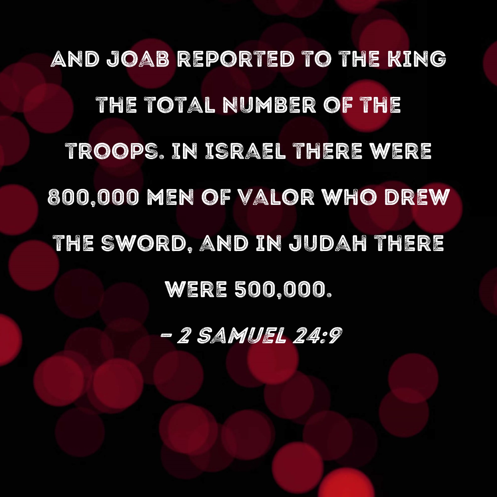 2 Samuel 24:9 And Joab reported to the king the total number of the troops. In Israel there were 800,000 men of valor who drew the sword, and in Judah there were 500,000.
