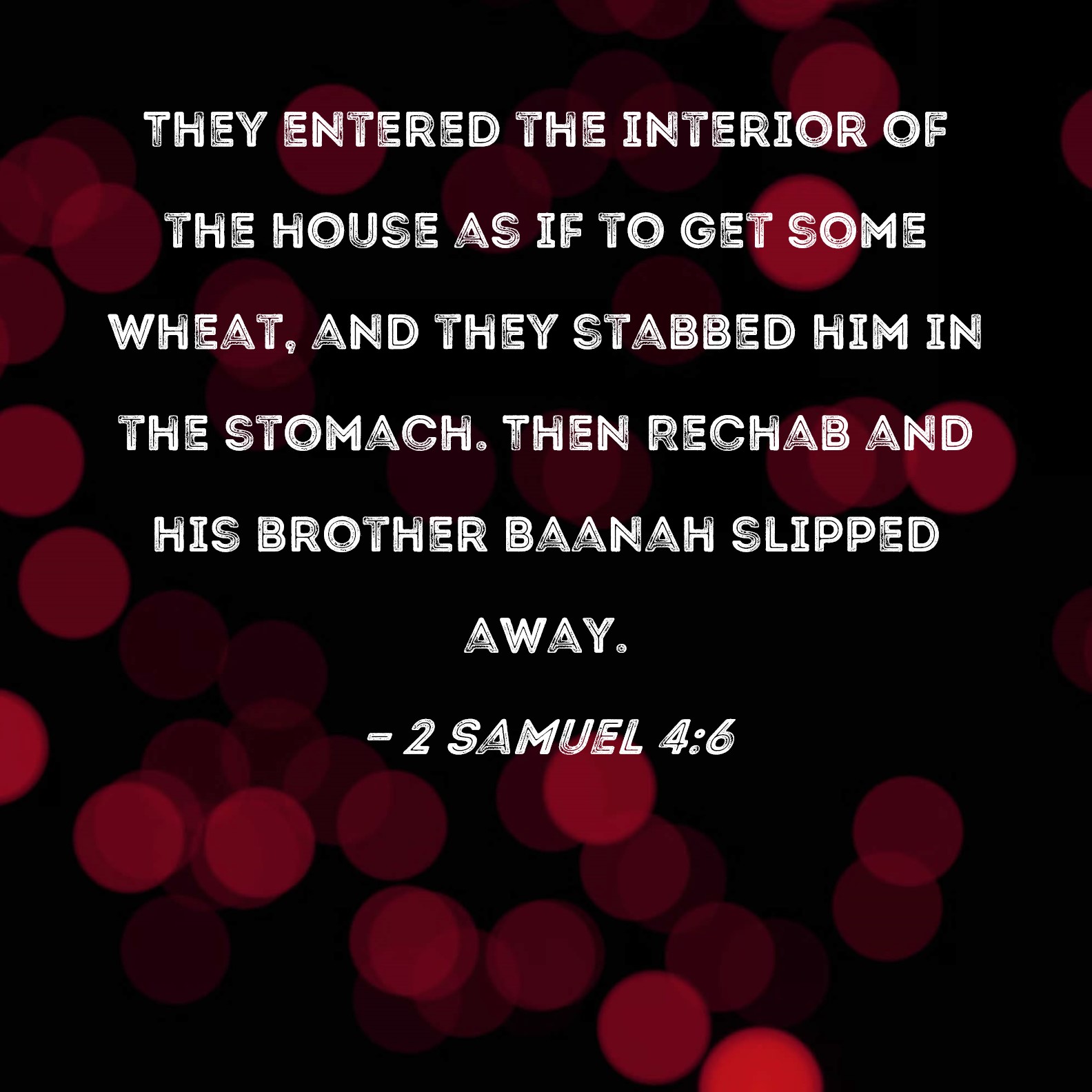 2 Samuel 4:6 They entered the interior of the house as if to get some wheat, and they stabbed him in the stomach. Then Rechab and his brother Baanah slipped away.
