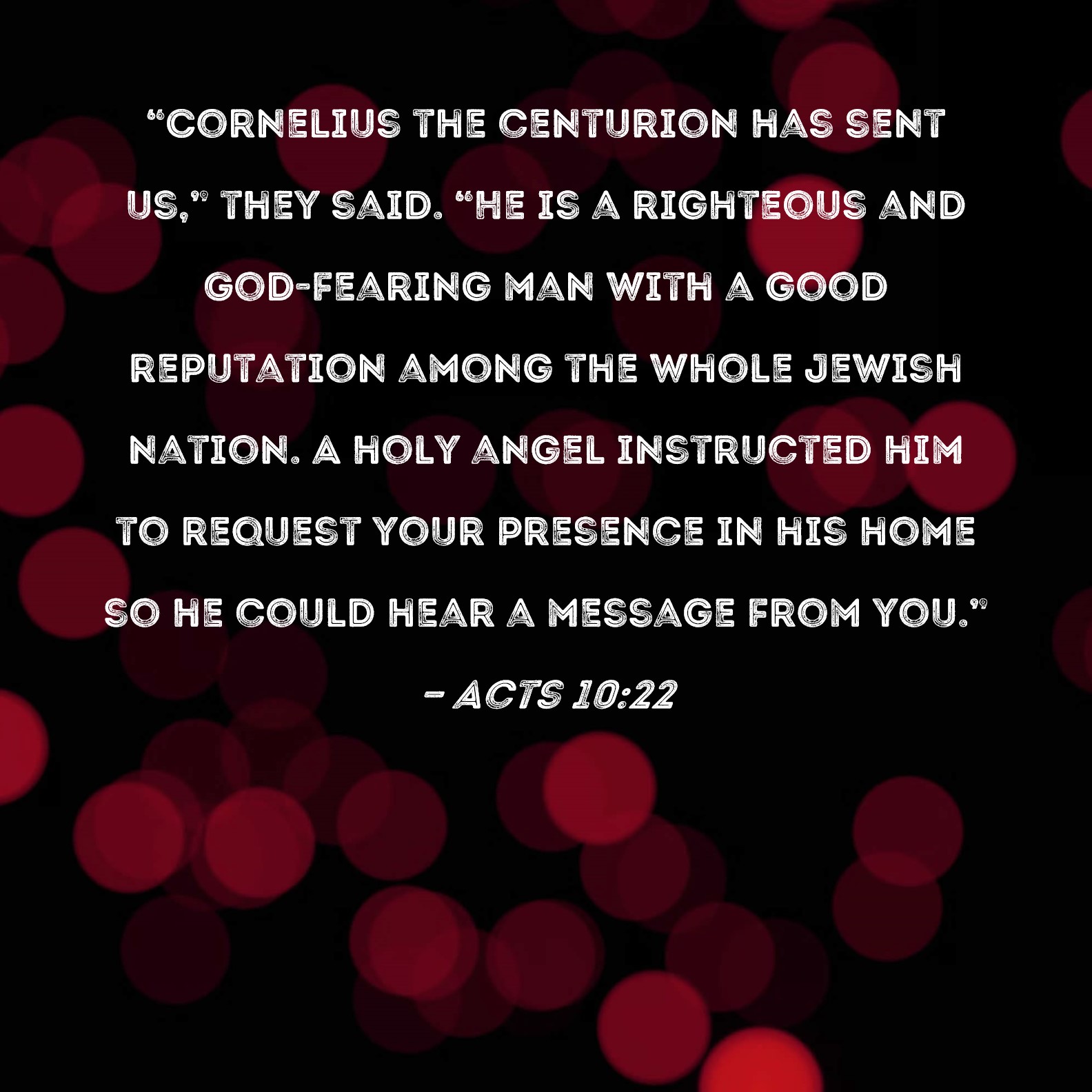 Acts 10:22 "Cornelius the centurion has sent us," they said. "He is a righteous and God-fearing man with a good reputation among the whole Jewish nation. A holy angel instructed him to request your presence in his home so he could hear a message from you."