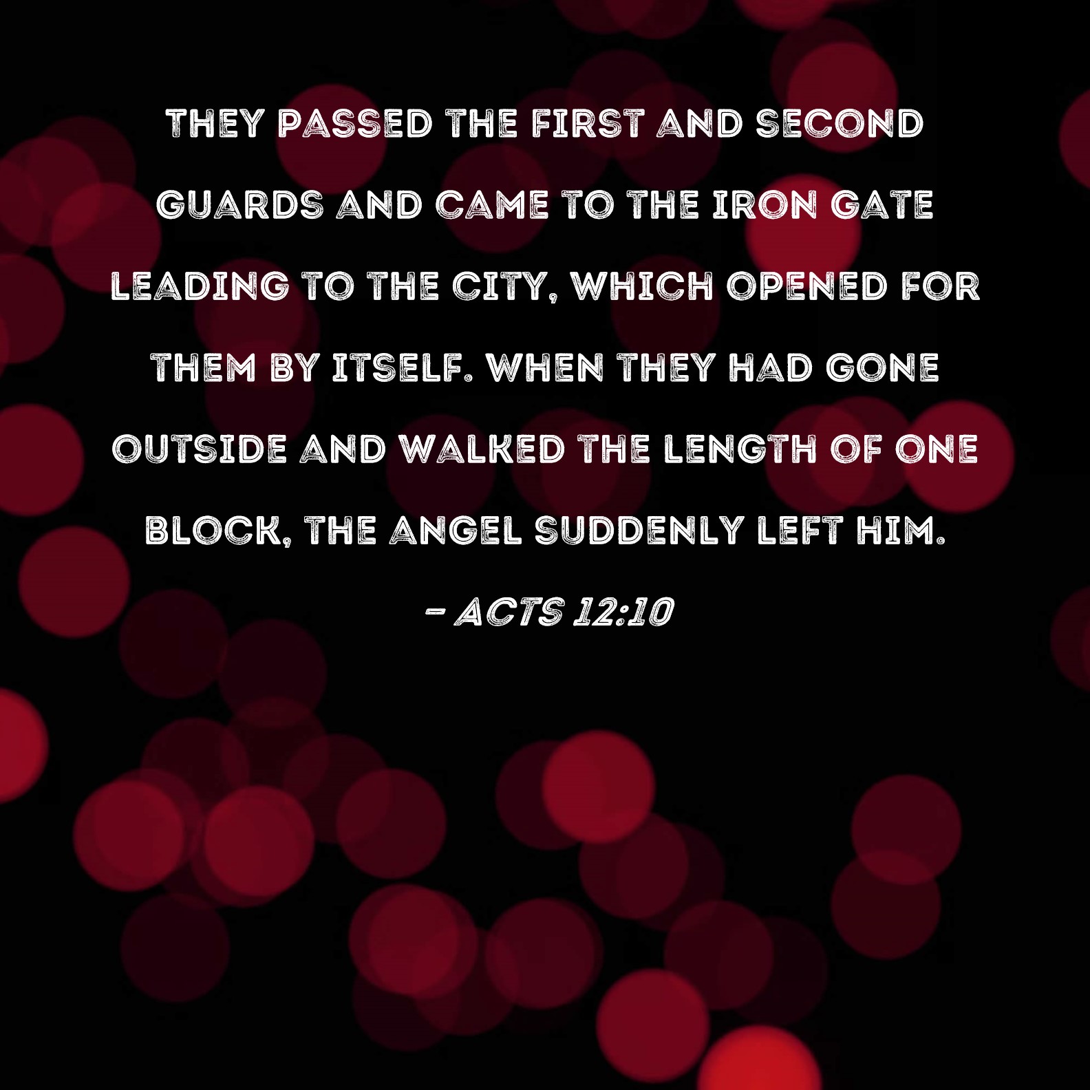 Acts 12:10 They passed the first and second guards and came to the iron gate leading to the city, which opened for them by itself. When they had gone outside and walked the length of one block, the angel suddenly left him.