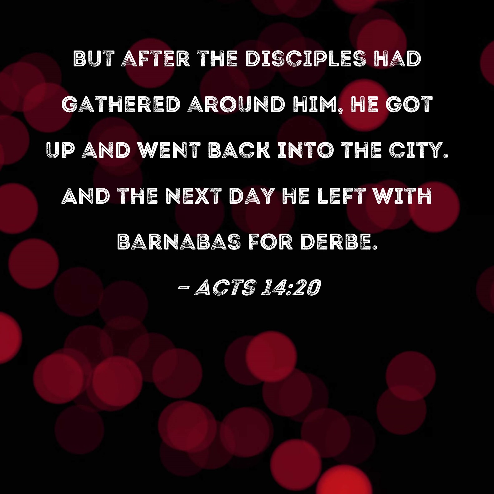 Acts 14:20 But after the disciples had gathered around him, he got up and went back into the city. And the next day he left with Barnabas for Derbe.