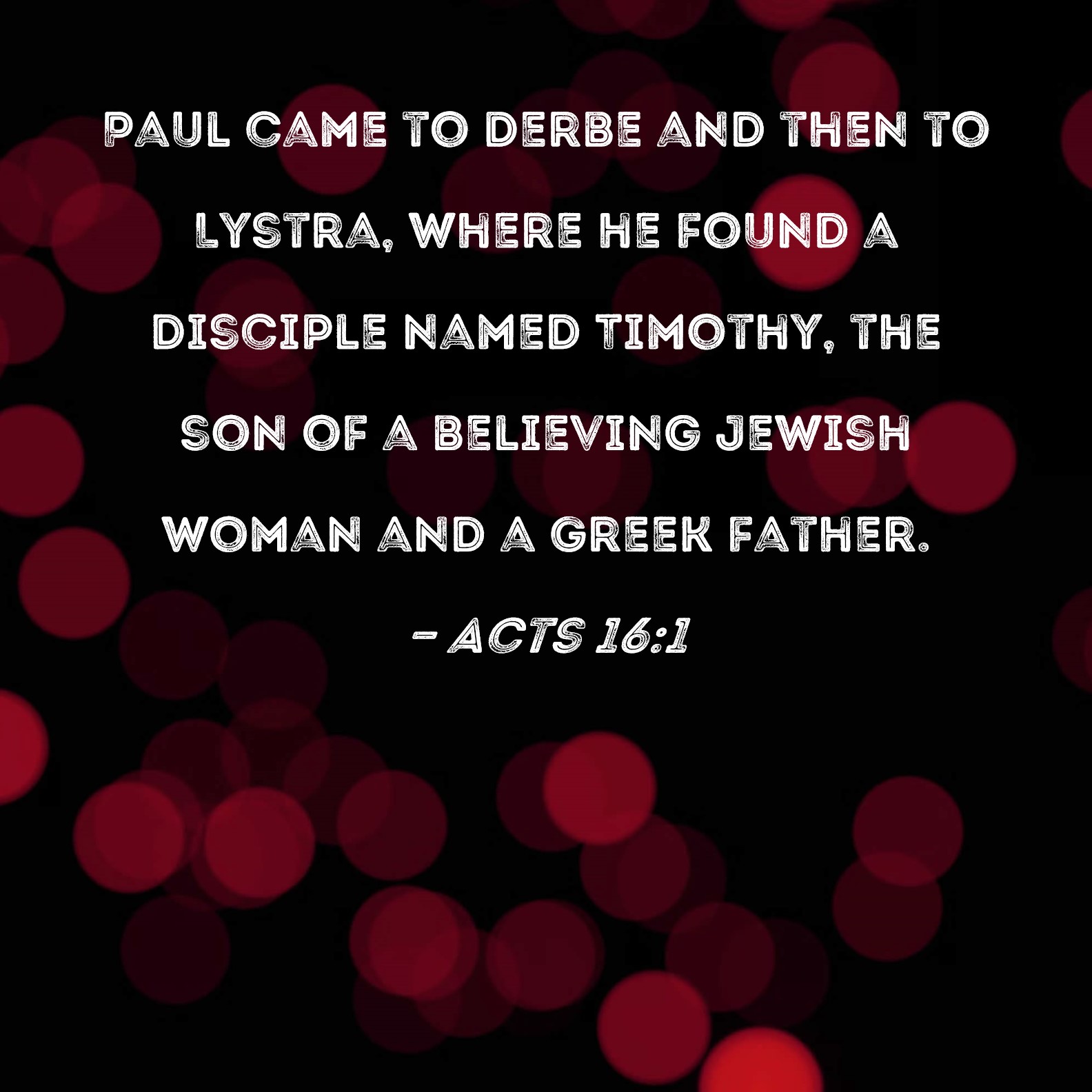 Acts 16:1 Paul came to Derbe and then to Lystra, where he found a disciple named Timothy, the son of a believing Jewish woman and a Greek father.