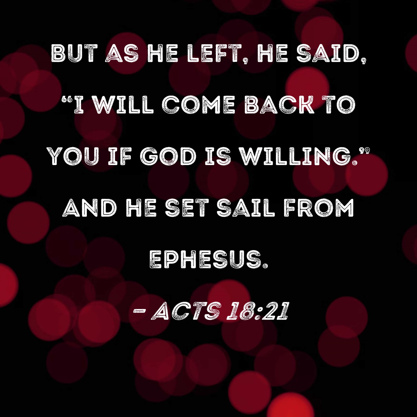 Acts 18:21 But as he left, he said, "I will come back to you if God is willing." And he set sail from Ephesus.