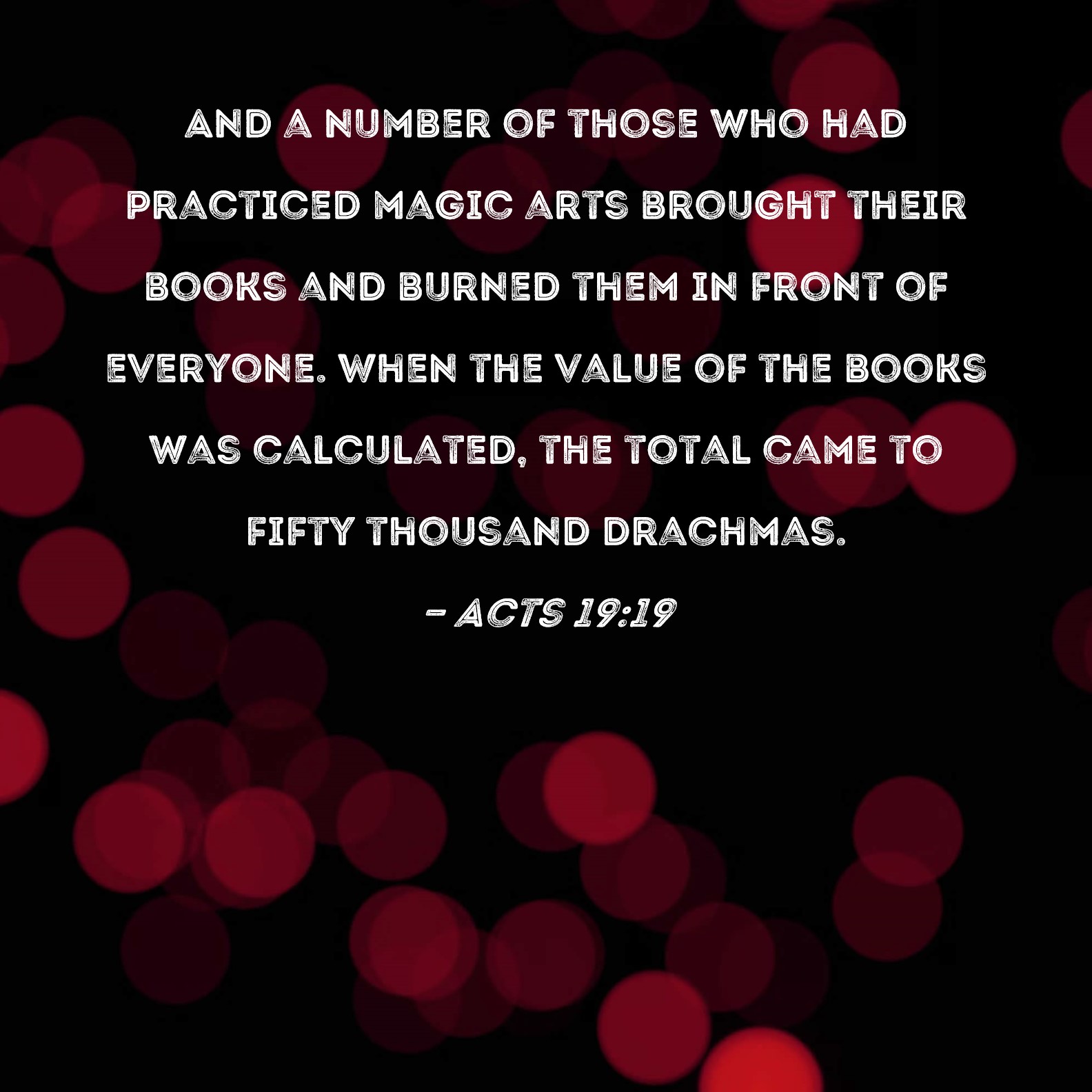 Acts 19:19 And a number of those who had practiced magic arts brought their books and burned them in front of everyone. When the value of the books was calculated, the total came to fifty thousand drachmas.