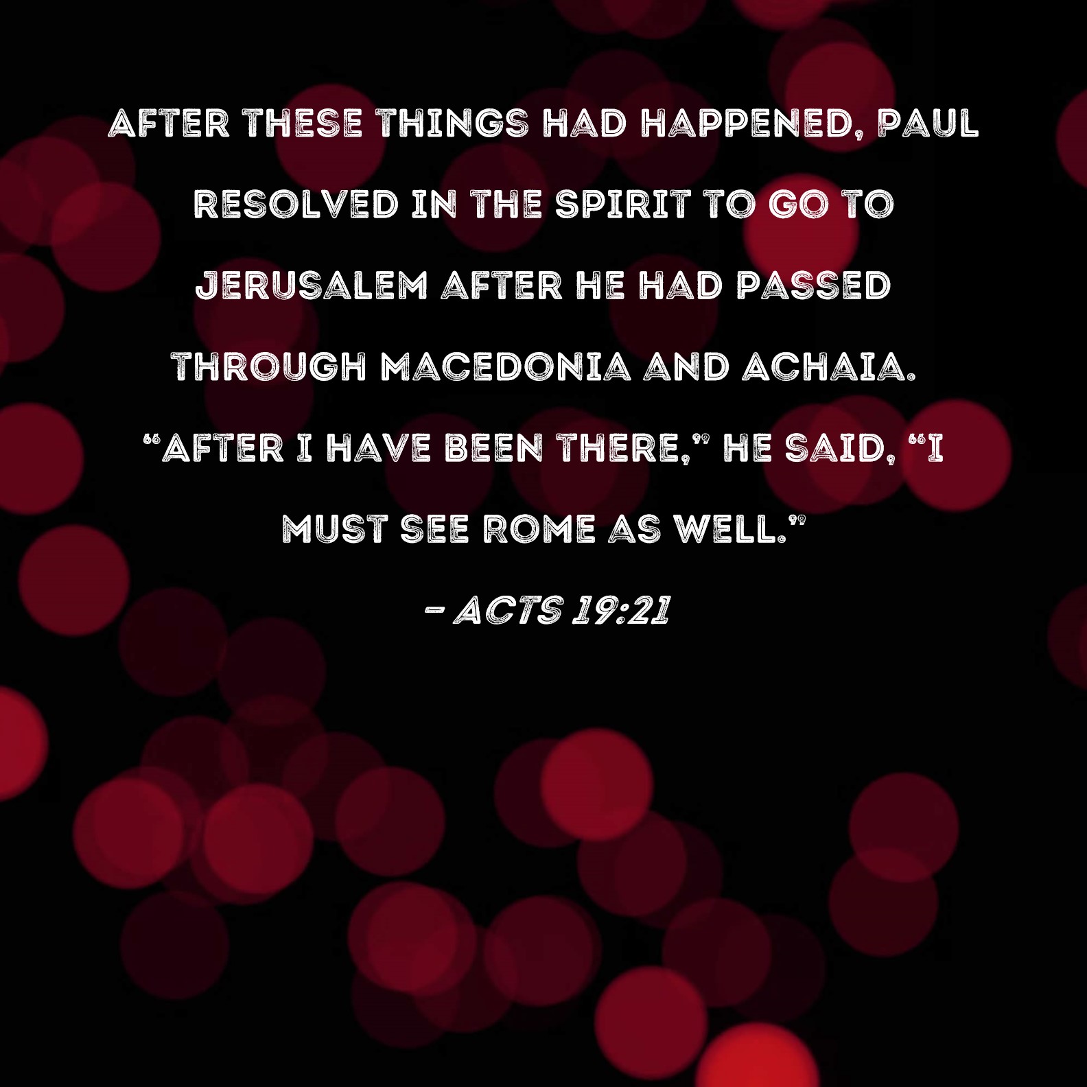 Acts 19:21 After these things had happened, Paul resolved in the Spirit to go to Jerusalem after he had passed through Macedonia and Achaia. "After I have been there," he said, "I must see Rome as well."