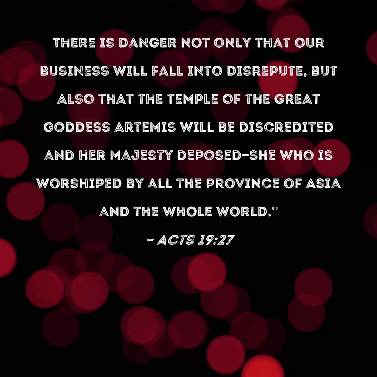 Acts 19:27 There is danger not only that our business will fall into disrepute, but also that the temple of the great goddess Artemis will be discredited and her majesty deposed--she who is worshiped by all the province of Asia and the whole world."
