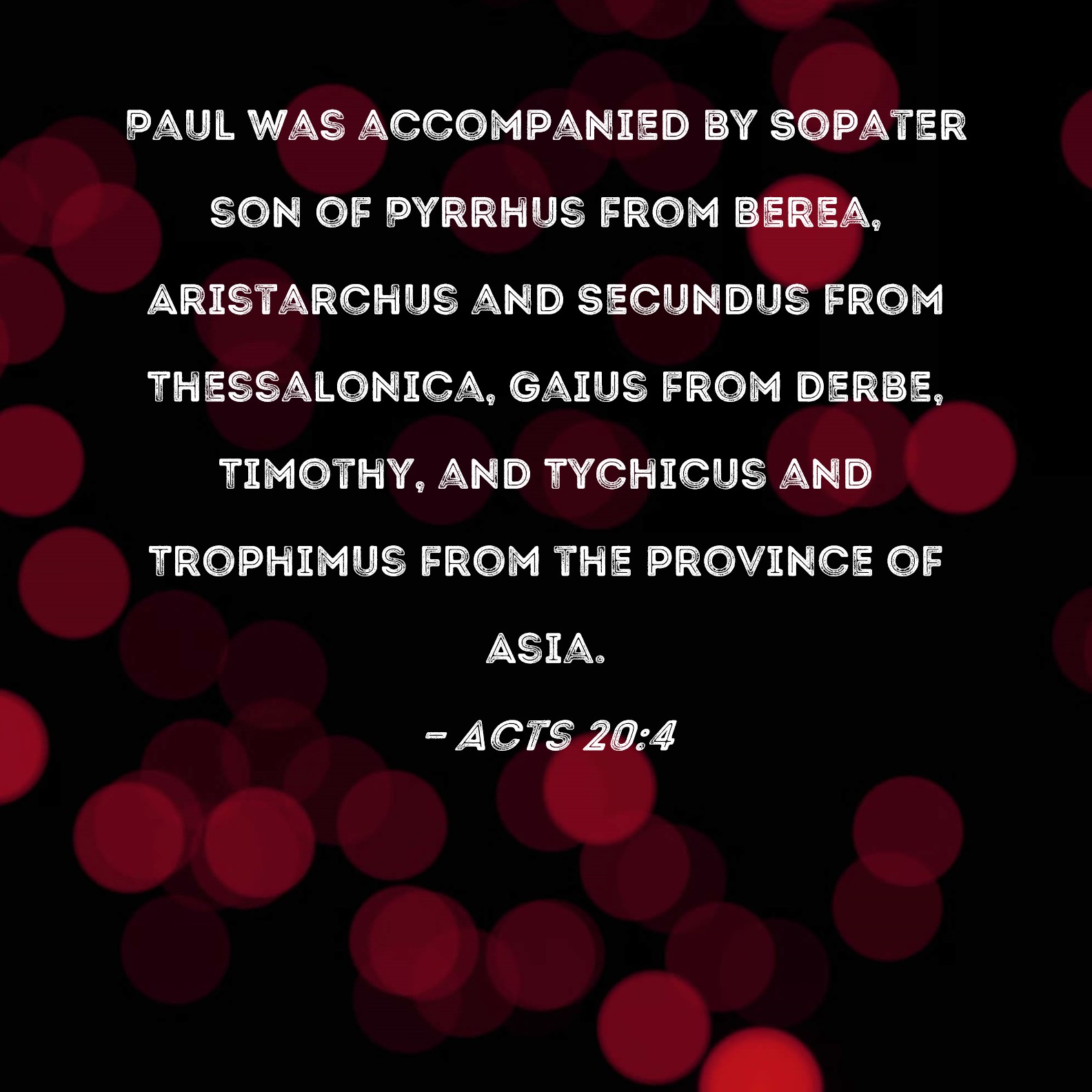 Acts 20:4 Paul was accompanied by Sopater son of Pyrrhus from Berea, Aristarchus and Secundus from Thessalonica, Gaius from Derbe, Timothy, and Tychicus and Trophimus from the province of Asia.