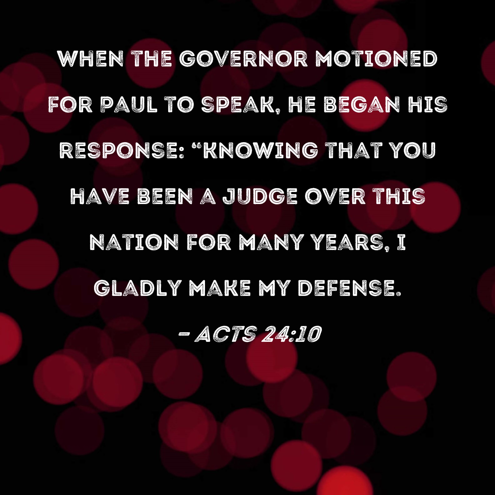 Acts 24:10 When the governor motioned for Paul to speak, he began his response: "Knowing that you have been a judge over this nation for many years, I gladly make my defense.