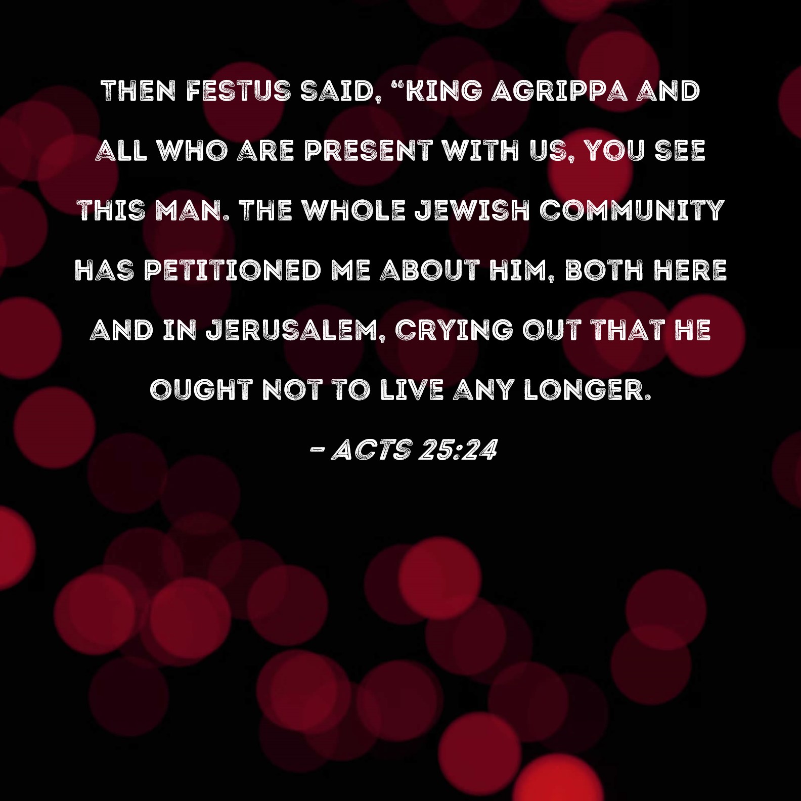 Acts 25:24 Then Festus said, "King Agrippa and all who are present with us, you see this man. The whole Jewish community has petitioned me about him, both here and in Jerusalem, crying out that he ought not to live any longer.