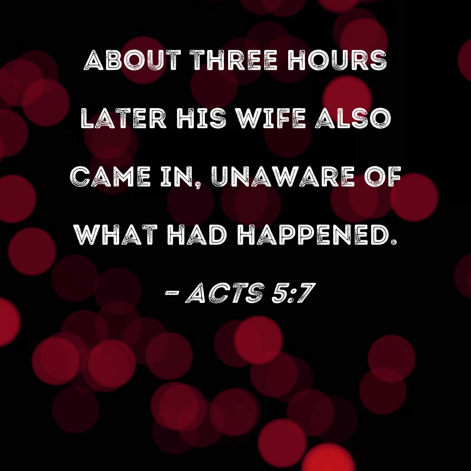 Acts 5:7 About three hours later his wife also came in, unaware of what had happened.