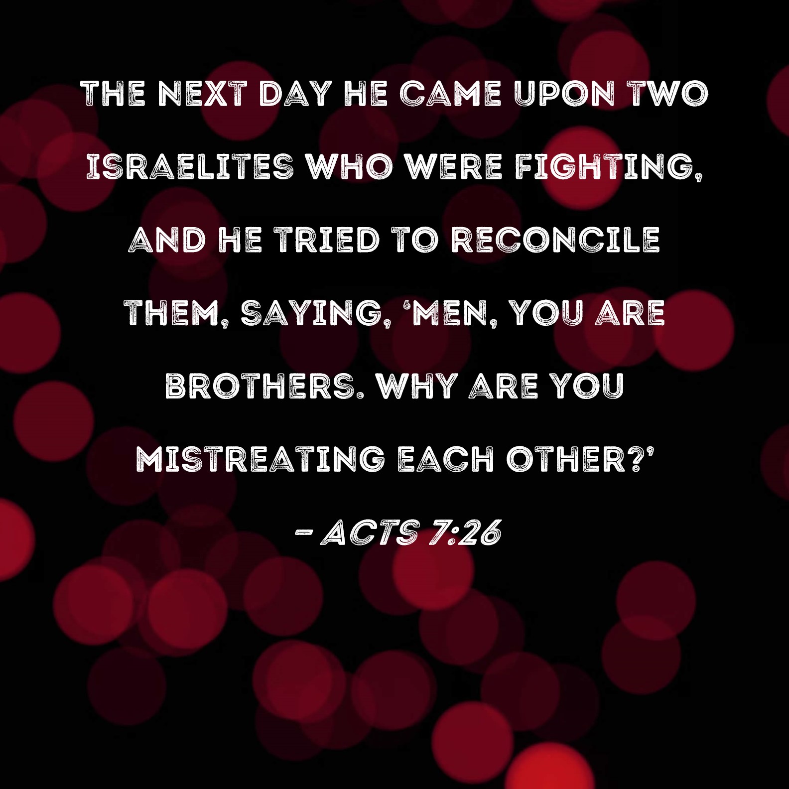 Acts 7:26 The next day he came upon two Israelites who were fighting, and he tried to reconcile them, saying, 'Men, you are brothers. Why are you mistreating each other?'